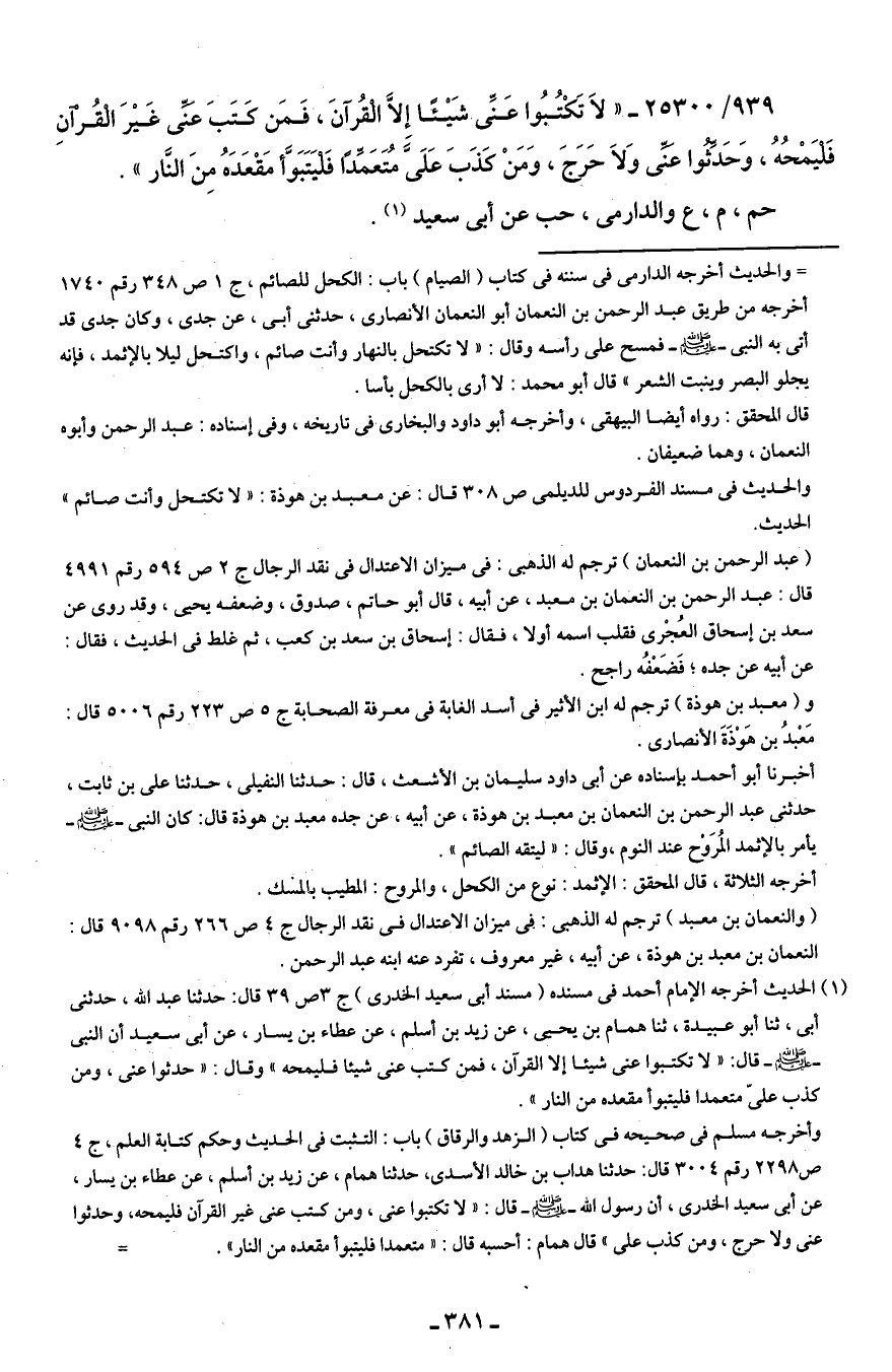 939/ 25300 - "لاَ تَكْتُبُوا عَنى شَيْئًا إِلَّا القُرآنَ، فَمَن كَتَبَ عنِّى غَيْرَ القُرآنِ فَليَمْحُهُ، وَحَدثوا عنِّى وَلاَ حَرَجَ، وَمَنْ كَذَبَ عَلَى مُتَعَمدًا فَليَتَبَوأ مَقْعَدَهُ مِنَ النَّار".