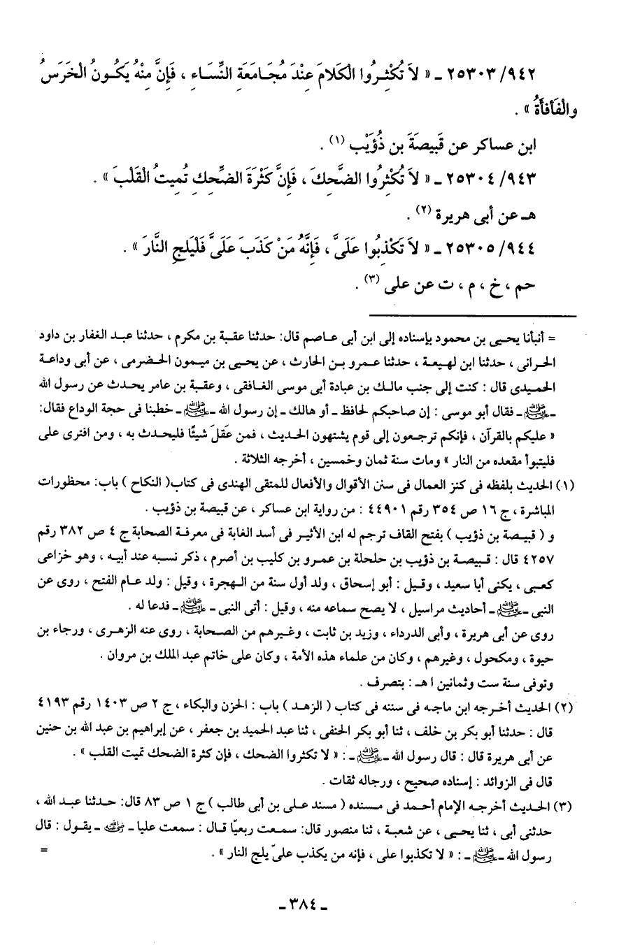 943/ 25304 - "لاَ تُكْثِرُوا الضَّحِكَ، فَإِن كَثْرَةَ الضَّحِكِ تُمِيتُ القَلبَ".