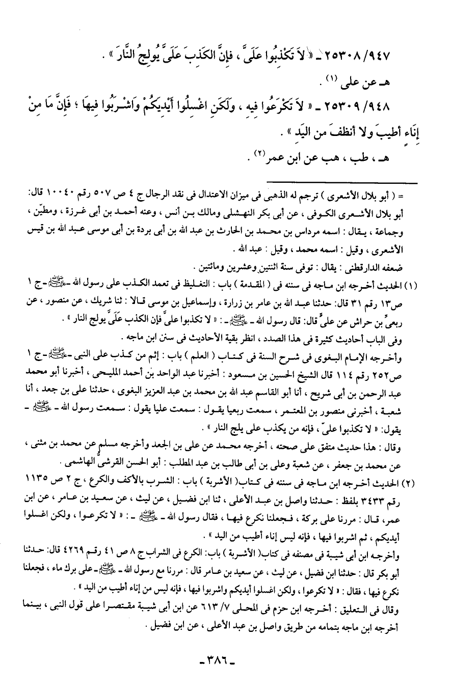 947/ 25308 - "لاَ تَكْذِبُوا عَلَيَّ، فإِنَّ الكَذِبَ عَلَيَّ يُولِجُ النَّارَ".