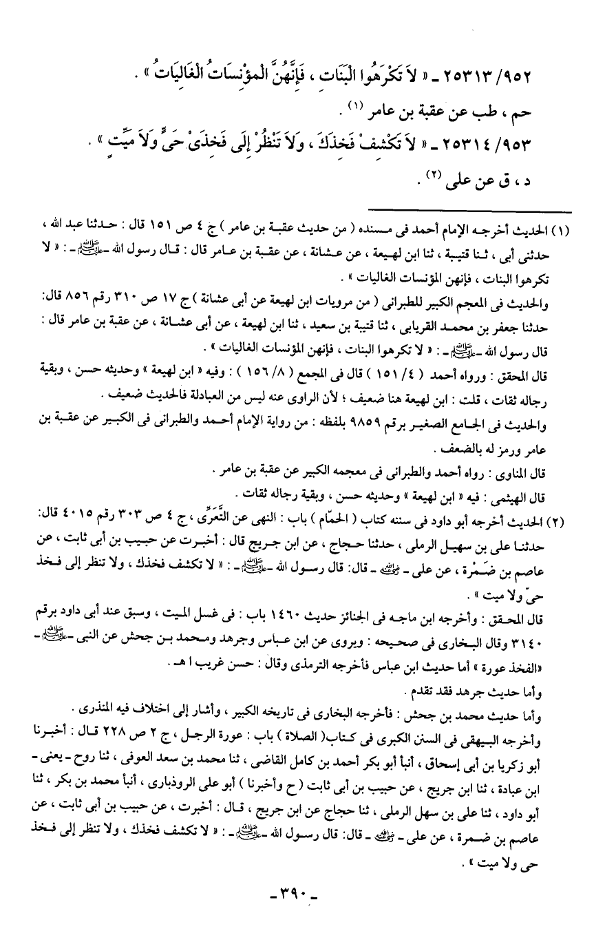 قال المحقق: وأخرجه ابن ماجه في الجنائز حديث 1460 باب: في غسل الميت، وسبق عند أبي داود برقم 3140 وقال البُخاريّ في صحيحه: ويروى عن ابن عباس وجرهد ومحمد بن جحش عن النَّبيّ - صلى الله عليه وسلم - "الفخذ عورة" أما حديث ابن عباس فأخرجه التِّرمذيُّ وقال: حسن غريب اه.