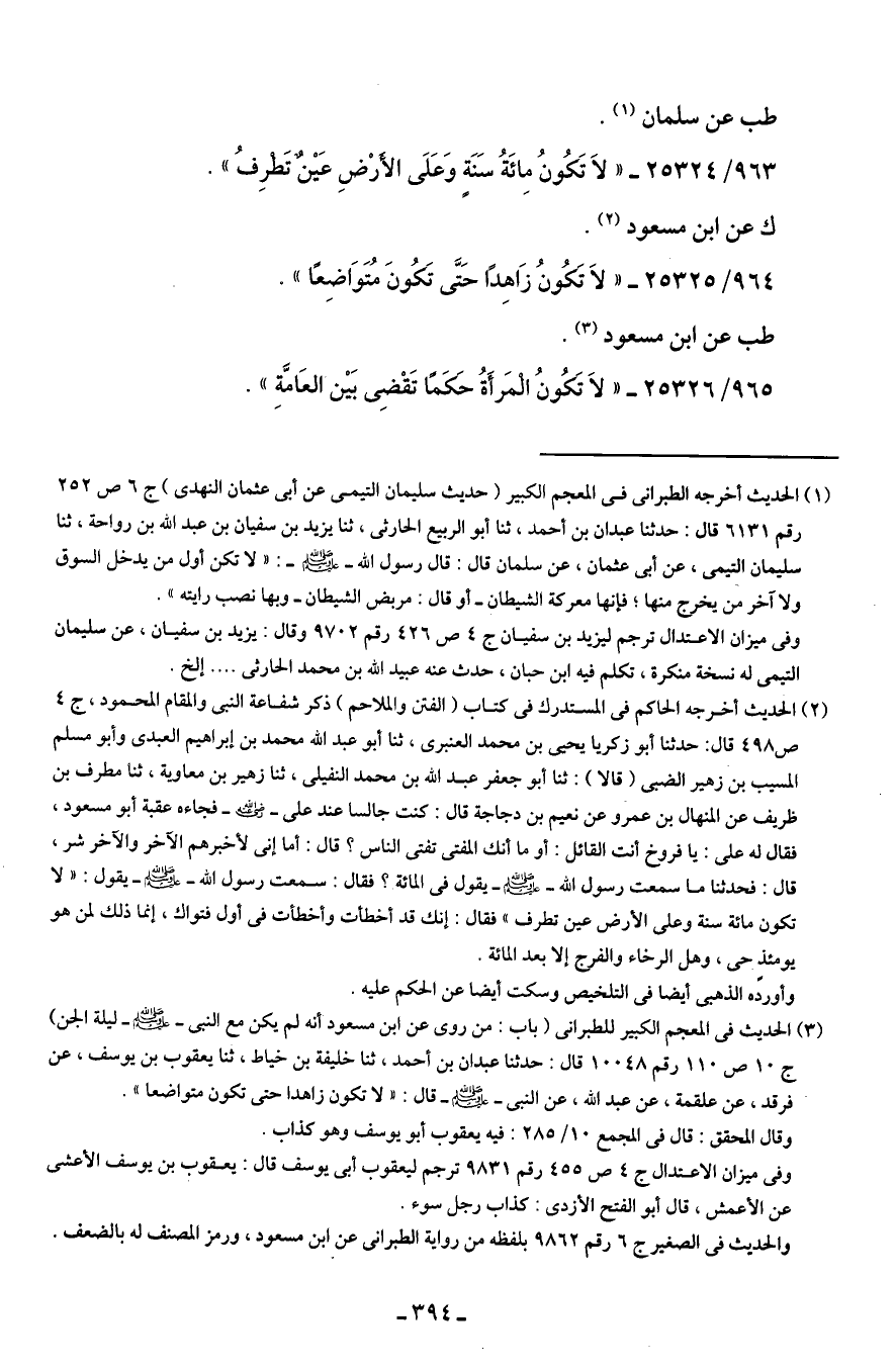 (¬2) الحديث أخرجه الحاكم في المستدرك في كتاب (الفتن والملاحم) ذكر شفاعة النَّبيّ والقام المحمود، ج 4 ص 498 قال: حدّثنا أبو زكريا يَحْيَى بن محمَّد العنبرى، ثنا أبو عبد الله محمَّد بن إبراهيم العبدى وأبو مسلم المسيب بن زهير الضبي (قالا): ثنا أبو جعفر عبد الله بن محمَّد النفيلى، ثنا زهير بن معاوية، ثنا مطرف بن ظريف عن المنهال بن عمرو عن نعيم بن دجاجة قال: كنت جالسًا عند على - رضي الله عنه - فجاءه عقبة أبو مسعود، فقال له علي: يا فروخ أنت القائل: أو ما أنك المفتي تفتى النَّاس؟ قال: أما إنى لأخبرهم الآخر والآخر شر، قال: فحدثنا ما سمعت رسول الله - صلى الله عليه وسلم - يقول في المائة؟ فقال: سمعت رسول الله - صلى الله عليه وسلم - يقول: "لا تكون مائة سنة وعلى الأرض عين تطرف" فقال: إنك قد أخطأت وأخطأت في أول فتواك، إنَّما ذلك لمن هو يومئذٍ حى، وهل الرخاء والفرج إلَّا بعد المائة.