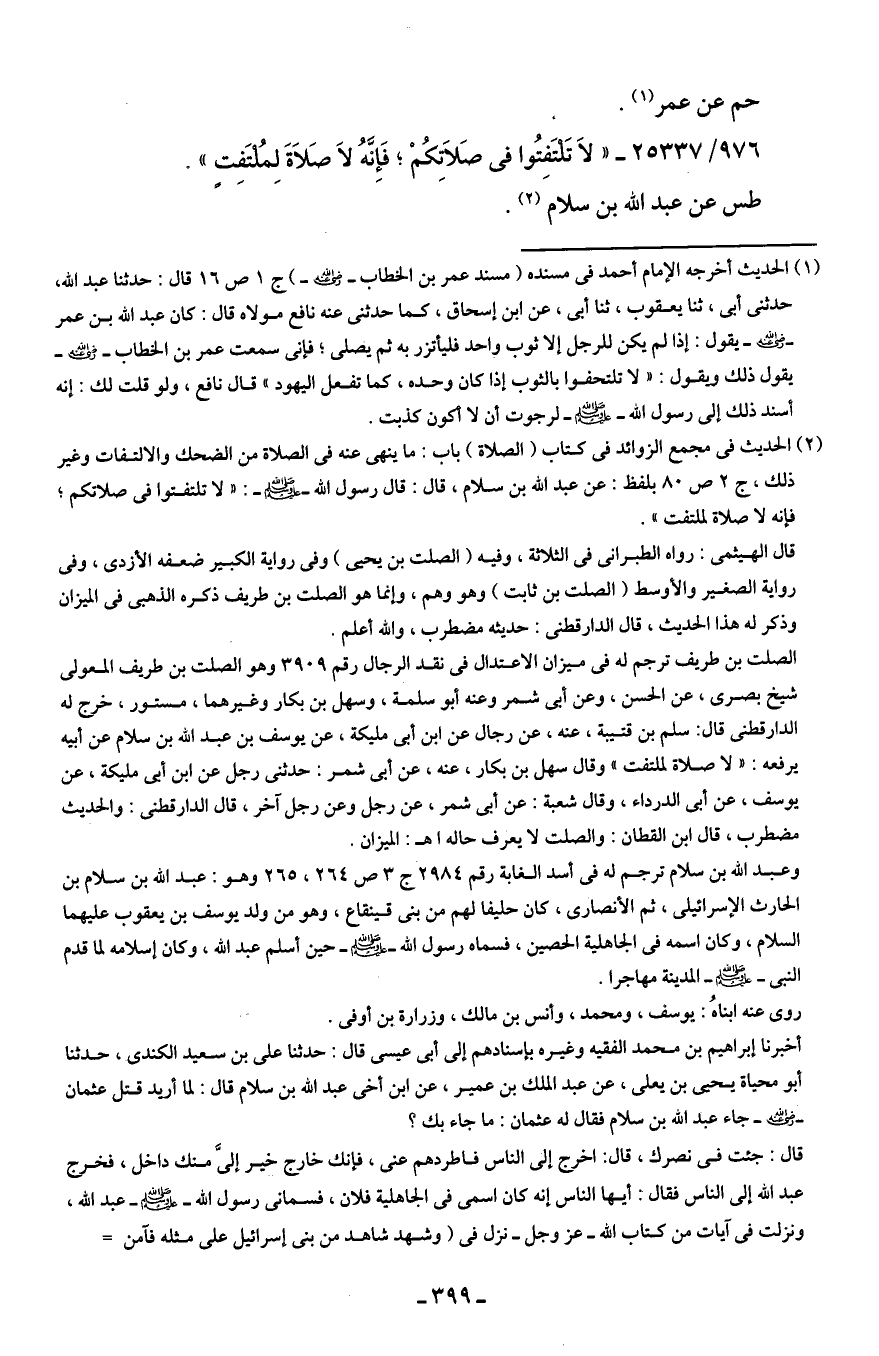 (¬2) الحديث في مجمع الزوائد في كتاب (الصلاة) باب: ما ينهى عنه في الصلاة من الضحك والالتفات وغير ذلك، ج 2 ص 80 بلفظ: عن عبد الله بن سلام، قال: قال رسول الله - صلى الله عليه وسلم -: "لا تلتفتوا في صلاتكم؛ فإنه لا صلاة لملتفت".