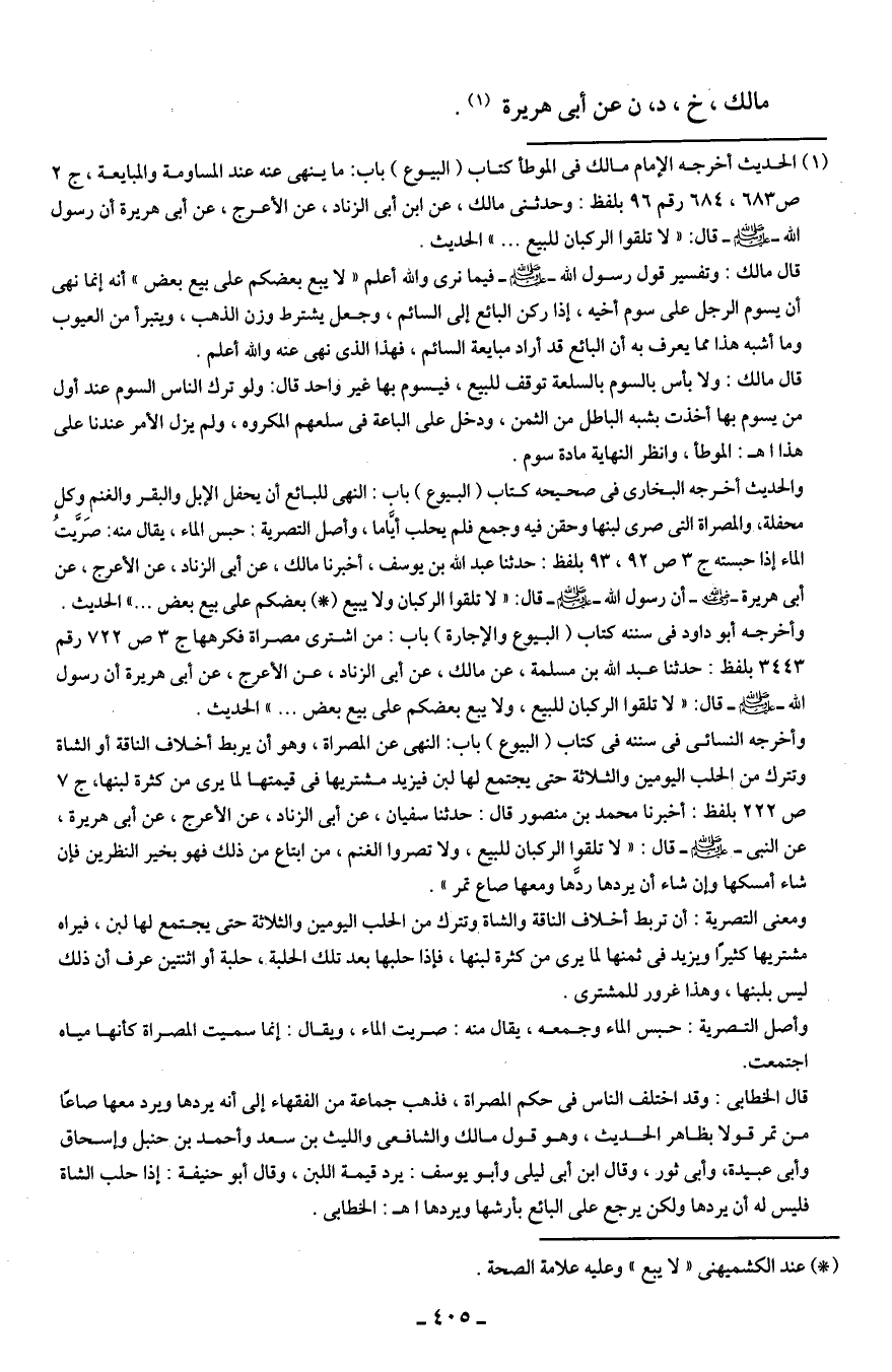 والحديث أخرجه البخارى في صحيحه كتاب (البيوع) باب: النهى للبائع أن يحفل الإبل والبقر والغنم وكل محفلة، والمصراة التى صرى لبنها وحقن فيه وجمع فلم يحلب أيَّاما، وأصل التصرية: حبس الماء، يقال منه: صَريَّتُ الماء إذا حبسته ج 3 ص 92، 93 بلفظ: حدثنا عبد الله بن يوسف، أخبرنا مالك، عن أَبى الزناد، عن الأعرج، عن أَبى هريرة - رضي الله عنه - أن رسول الله - صلى الله عليه وسلم - قال: "لا تلقوا الركبان ولا يبيع (*) بعضكم على بيع بعض ... " الحديث.