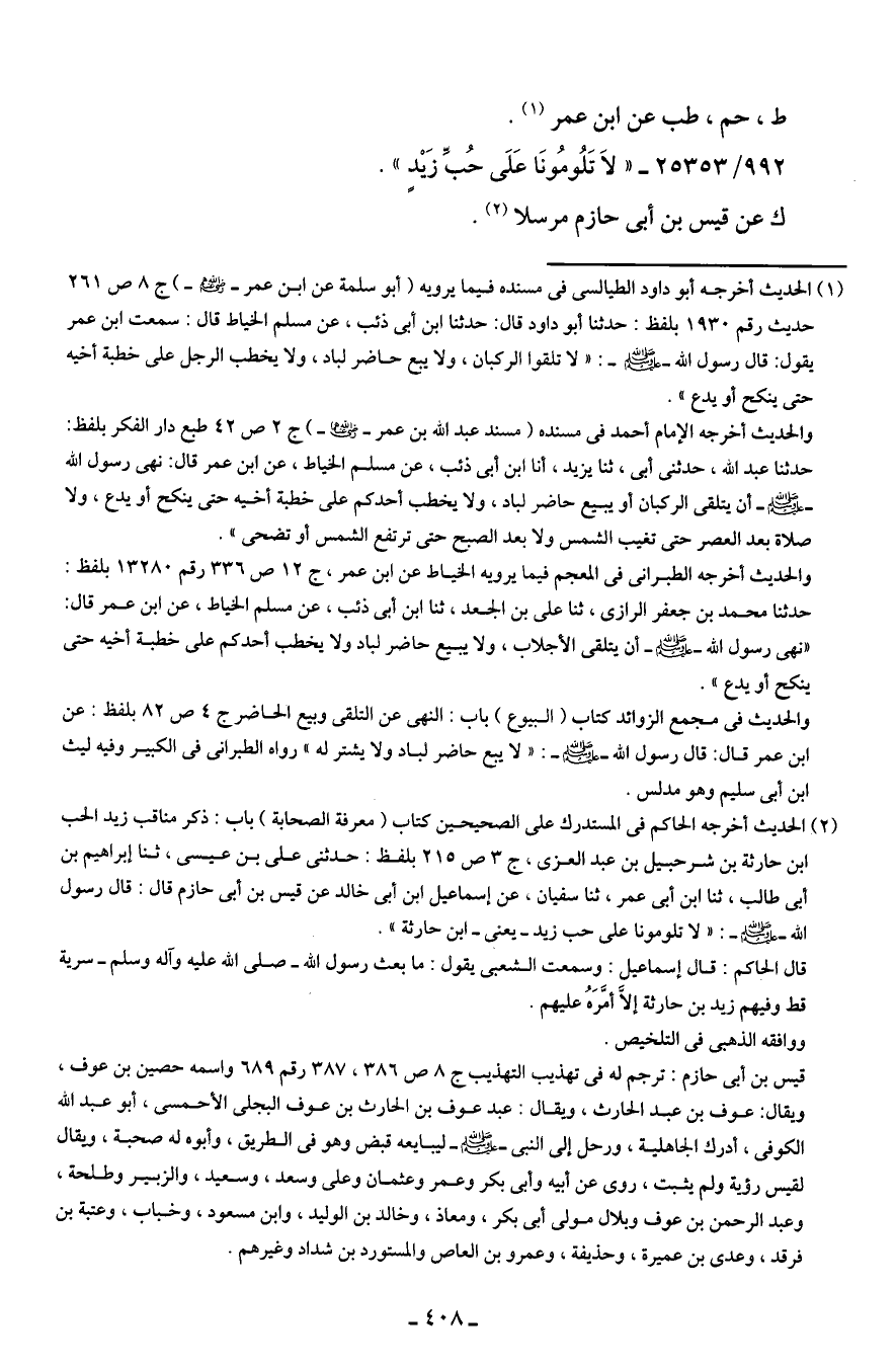 (¬2) الحديث أخرجه الحاكم في المستدرك على الصحيحين كتاب (معرفة الصحابة) باب: ذكر مناقب زيد الحب ابن حارثة بن شرحبيل بن عبد العزى، ج 3 ص 215 بلفظ: حدثنى على بن عيسى، ثنا إبراهيم بن أَبى طالب، ثنا ابن أبى عمر، ثنا سفيان، عن إسماعيل ابن أَبى خالد عن قيس بن أَبى حازم قال: قال رسول الله - صلى الله عليه وسلم -: "لا تلومونا على حب زيد - يعنى - ابن حارثة".
