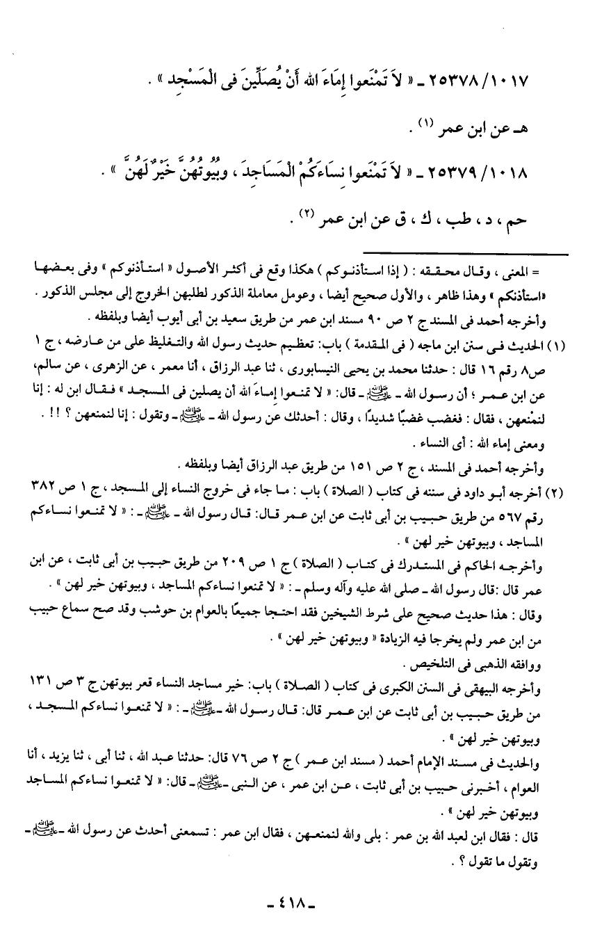 1017/ 25378 - "لاَ تَمْنَعوا إِمَاءَ الله أَنْ يُصَلِّينَ في الْمَسْجِد".