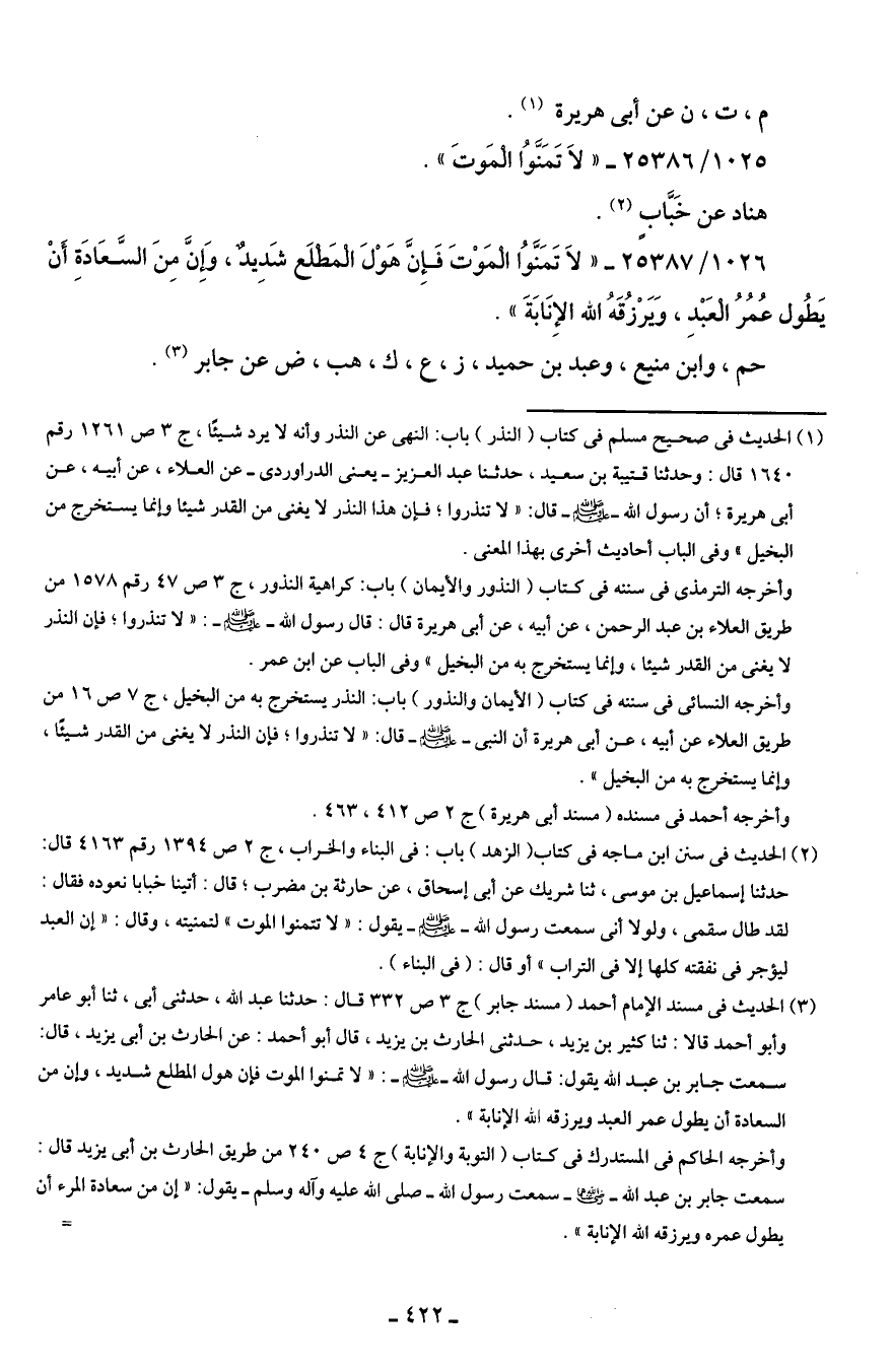 (¬3) الحديث في مسند الإمام أحمد (مسند جابر) ج 3 ص 332 قال: حدثنا عبد الله، حدثنى أَبى، ثنا أبو عامر وأبو أحمد قالا: ثنا كثير بن يزيد، حدثنى الحارث بن يزيد، قال أبو أحمد: عن الحارث بن أَبى يزيد، قال: سمعت جابر بن عبد الله يقول: قال رسول الله - صلى الله عليه وسلم -: "لا تمنوا الموت فإن هول المطلع شديد، وإن من السعادة أن يطول عمر العبد ويرزقه الله الإنابة".