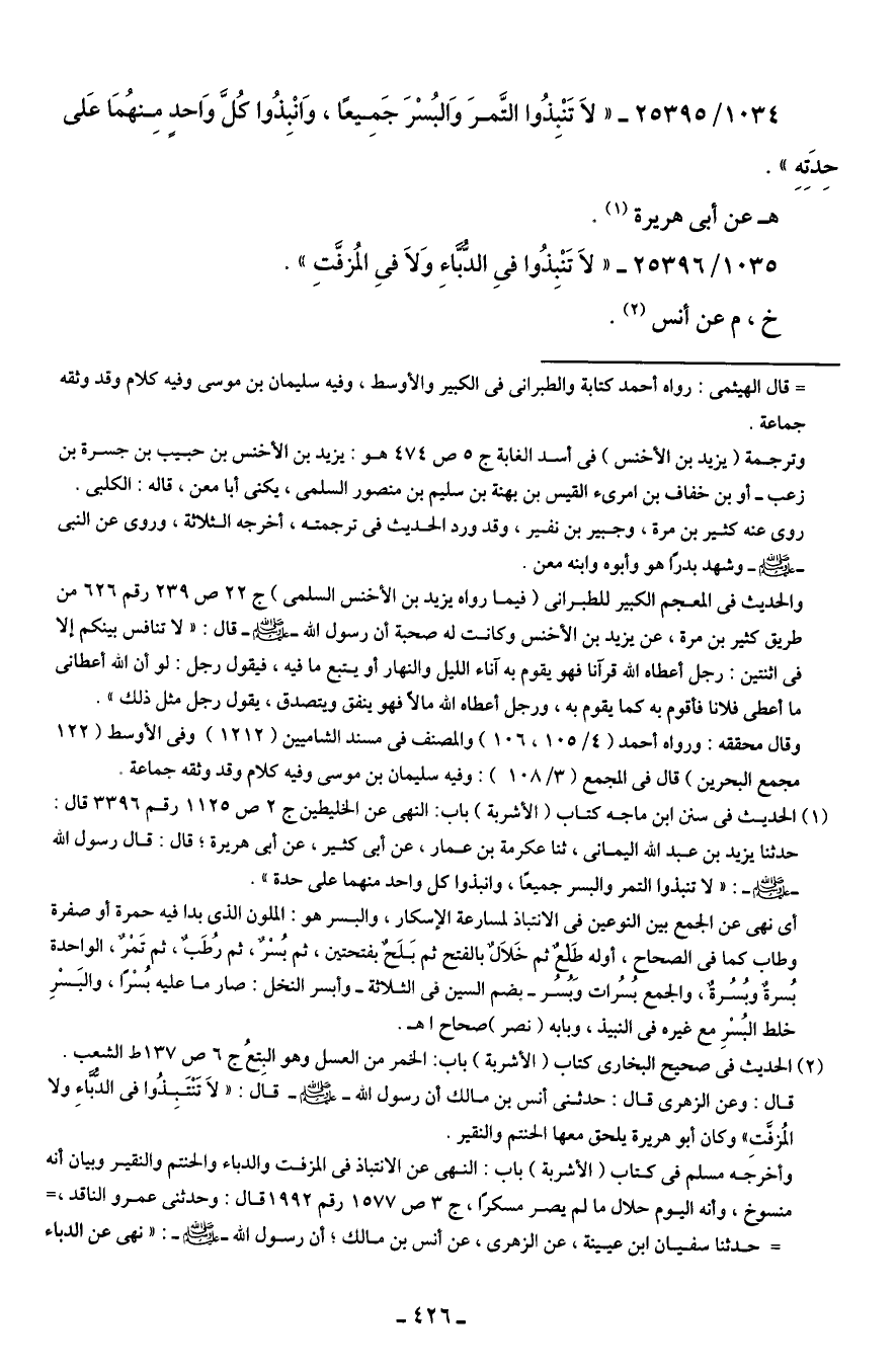 1034/ 25395 - "لاَ تَنْبِذُوا التَّمرَ وَالبُسْرَ جَمِيعًا، وَانْبِذُوا كُلَّ وَاحدٍ مِنهُمَا عَلى حِدَتِهِ".