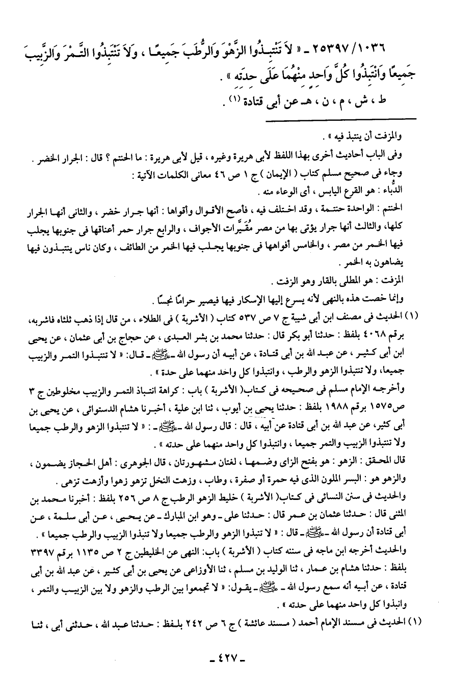 1036/ 25397 - "لاَ تَنْتبِذُوا الزَّهْوَ وَالرُّطَبَ جَمِيعًا، وَلاَ تَنْتَبِذُوا التَّمْرَ وَالزَّبِيبَ جَمِيعًا وَانْتَبِذُوا كُلَّ وَاحِدٍ مِنْهُمَا عَلَى حِدَتِهِ".