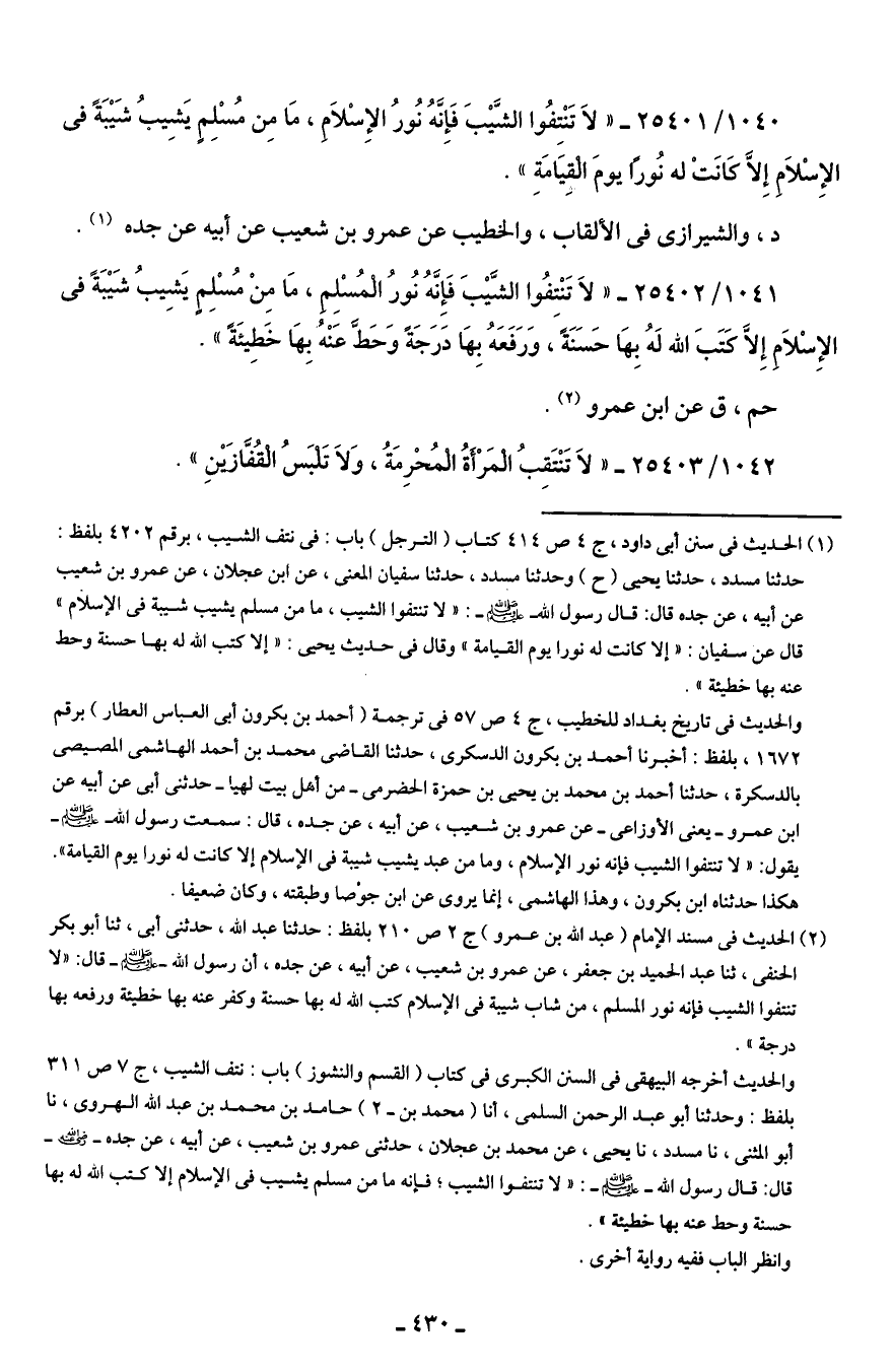 1040/ 25401 - " لَا تَنْتفُوا الشَّيْبَ فَإِنَّهُ نُورُ الإِسْلَامِ، مَا مِن مُسْلِمٍ يَشِيبُ شَيْبَةً في الإِسْلَا إِلَّا كَانَتْ له نُورًا يومَ الْقِيَامَةِ".