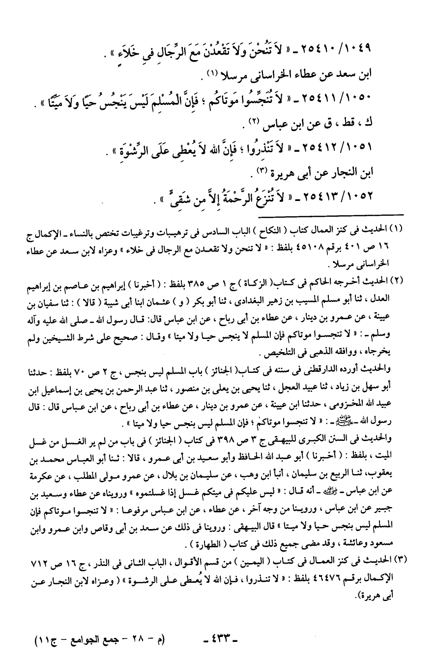 1050/ 25411 - "لَا تُنَجِّسُوا مَوتَاكُم، فَإنَّ المُسْلمَ لَيْسَ يَنْجُسُ حَيًّا وَلَا ميِّتًا".