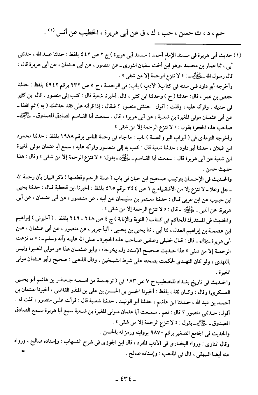 (¬1) حديث أبى هريرة في مسند الإمام أحمد (مسند أبى هريرة) ج 2 ص 442 بلفظ: حدثنا عبد الله، حدثنى أبى، ثنا عمار بن محمد، وهو ابن أخت سفيان الثورى - عن منصور، عن أبى عثمان، عن أبى هريرة قال: قال رسول الله - صلى الله عليه وسلم -: "لا تنزع الرحمة إلا من شقى".