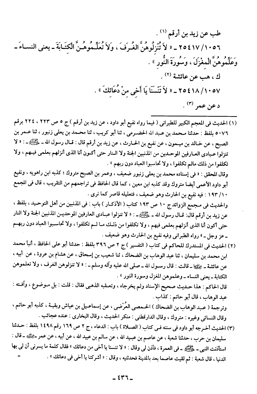 1056/ 25417 - "لَا تُنْزِلُوهُنَّ الغُرَفَ، وَلَا تُعَلِّمُوهُنَّ الْكِتَابَةَ - يعنى النساءَ - وَعَلِّمُوهُنَّ الْمِغْزَلَ، وَسُورَةَ النُّورِ".