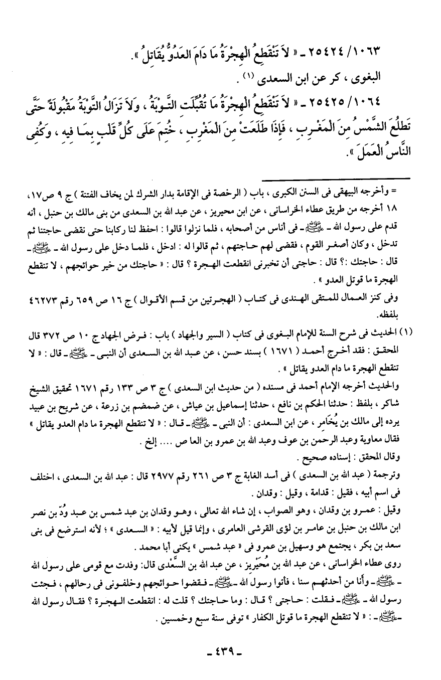(¬1) الحديث في شرح السنة للإمام البغوى في كتاب (السير والجهاد) باب: فرض الجهاد ج 10 ص 372 قال المحقق: فقد أخرج أحمد (1671) بسند حسن، عن عبد الله بن السعدى أن النبي - صلى الله عليه وسلم - قال: "لا تنقطع الهجرة ما دام العدو يقاتل".