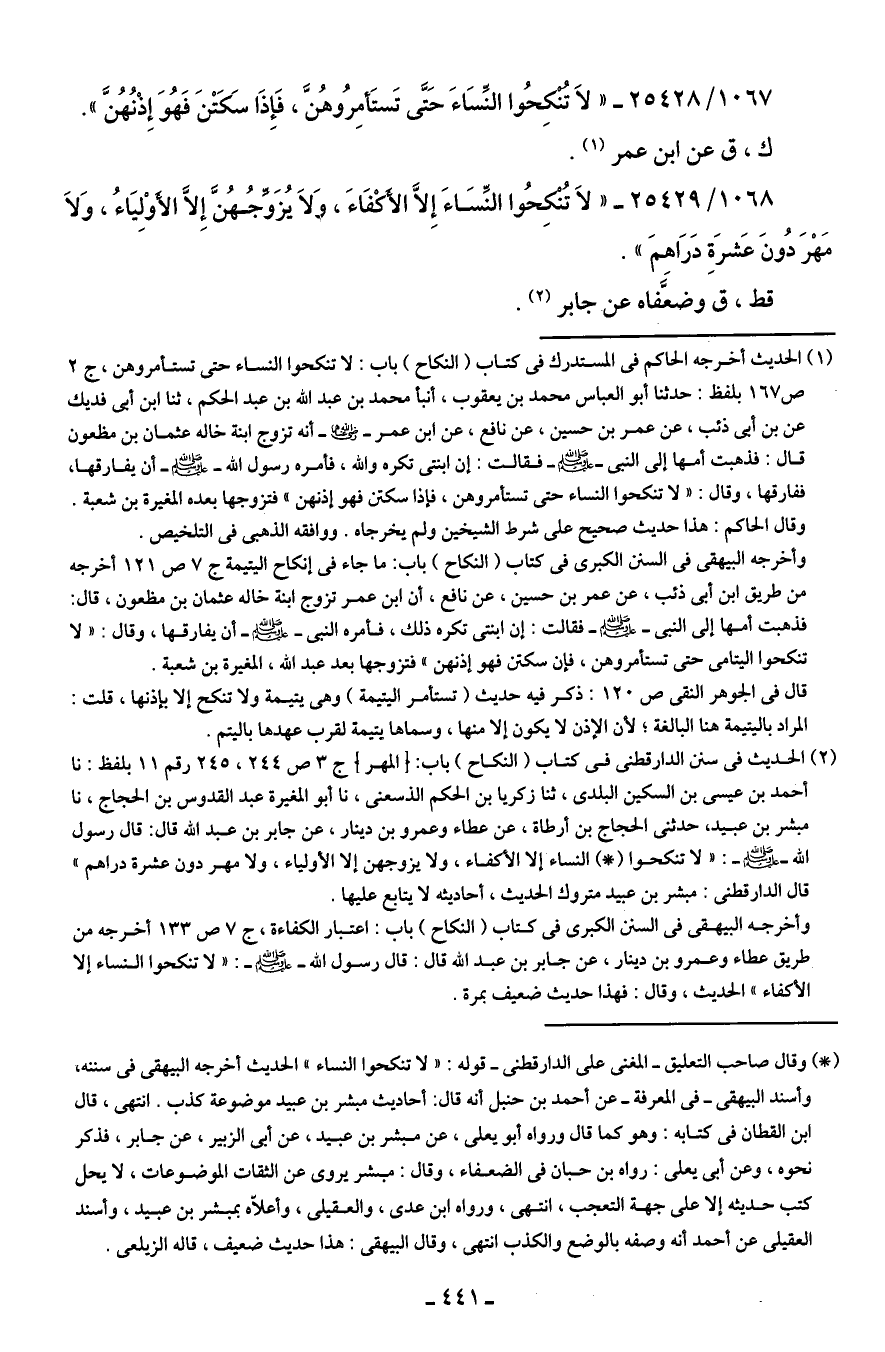 1068/ 25429 - "لَا تُنْكِحُوا النِّسَاءَ إِلَّا الأَكْفَاءَ، لَا يُزَوِّجُهُنَّ إِلَّا الأَوْلِيَاءُ، وَلَا مَهْرَ دُونَ عَشرَةِ دَرَاهمَ".