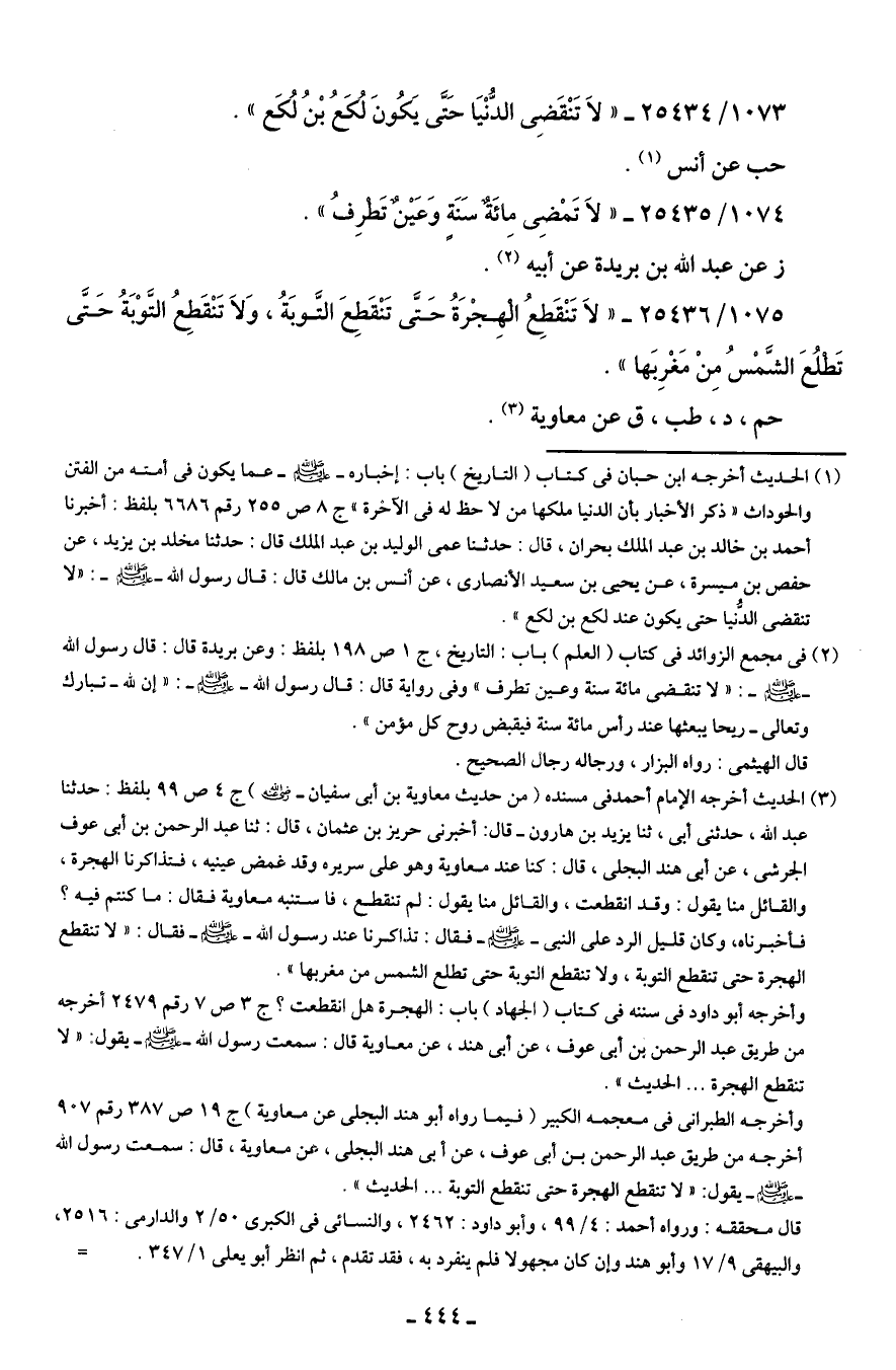 1075/ 25436 - "لَا تَنْقَطِعُ الْهِجْرَةُ حَتَّى تَنْقَطِعَ التَّوبَةُ، وَلَا تَنْقَطِعُ التَّوْبَةُ حَتَّى تَطلُعَ الشَّمْسُ مِنْ مَغْرِبَها".