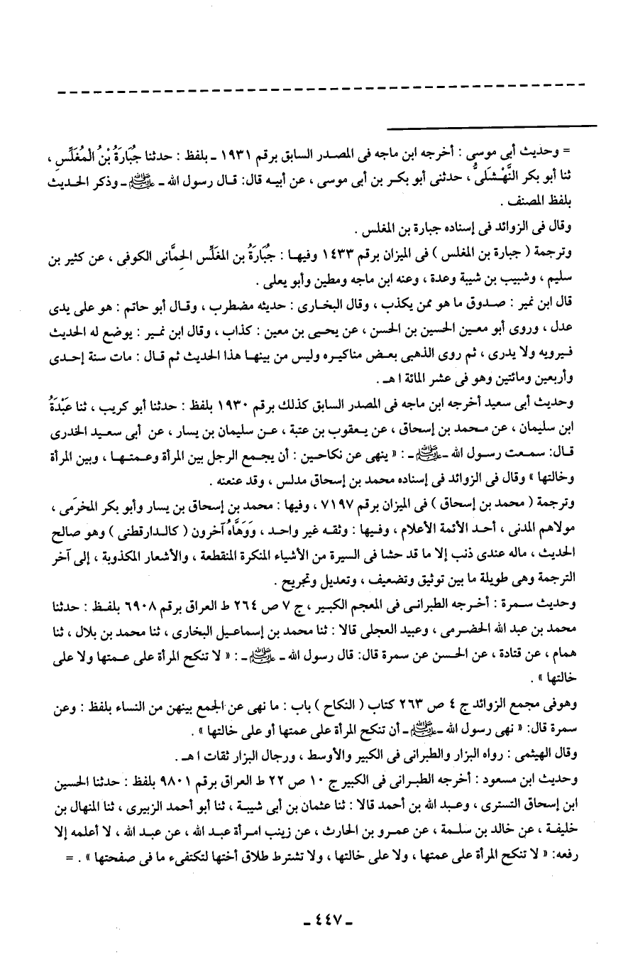 وحديث ابن مسعود: أخرجه الطبرانى في الكبير ج 10 ص 22 ط العراق برقم 9801 بلفظ: حدثنا الحسين ابن إسحاق التسترى، وعبد الله بن أحمد قالا: ثنا عثمان بن أبى شيبة، ثنا أبو أحمد الزبيرى، ثنا المنهال بن خليفة، عن خالد بن سلمة، عن عمرو بن الحارث، عن زينب امرأة عبد الله، عن عبد الله، لا أعلمه إلا رفعه: "لا تنكح المرأة على عمتها، ولا على خالتها، ولا تشترط طلاق أختها لتكتفئ ما في صفحتها". =