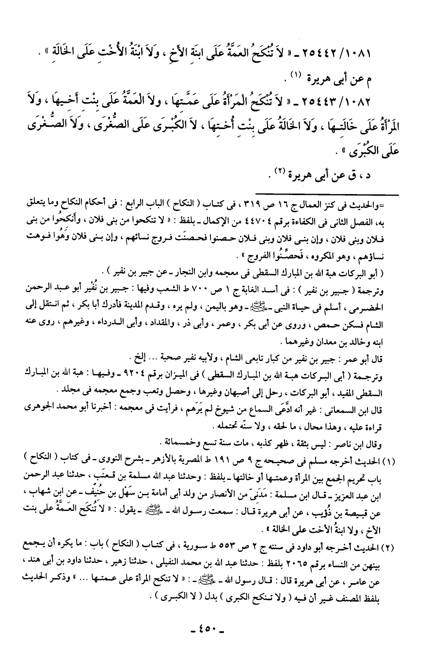 1081/ 25442 - "لَا تُنْكَحُ العَمَّةُ عَلَى ابنَةِ الأَخ، وَلَا ابْنَةُ الأُخْتِ عَلَى الخَالَةِ".
