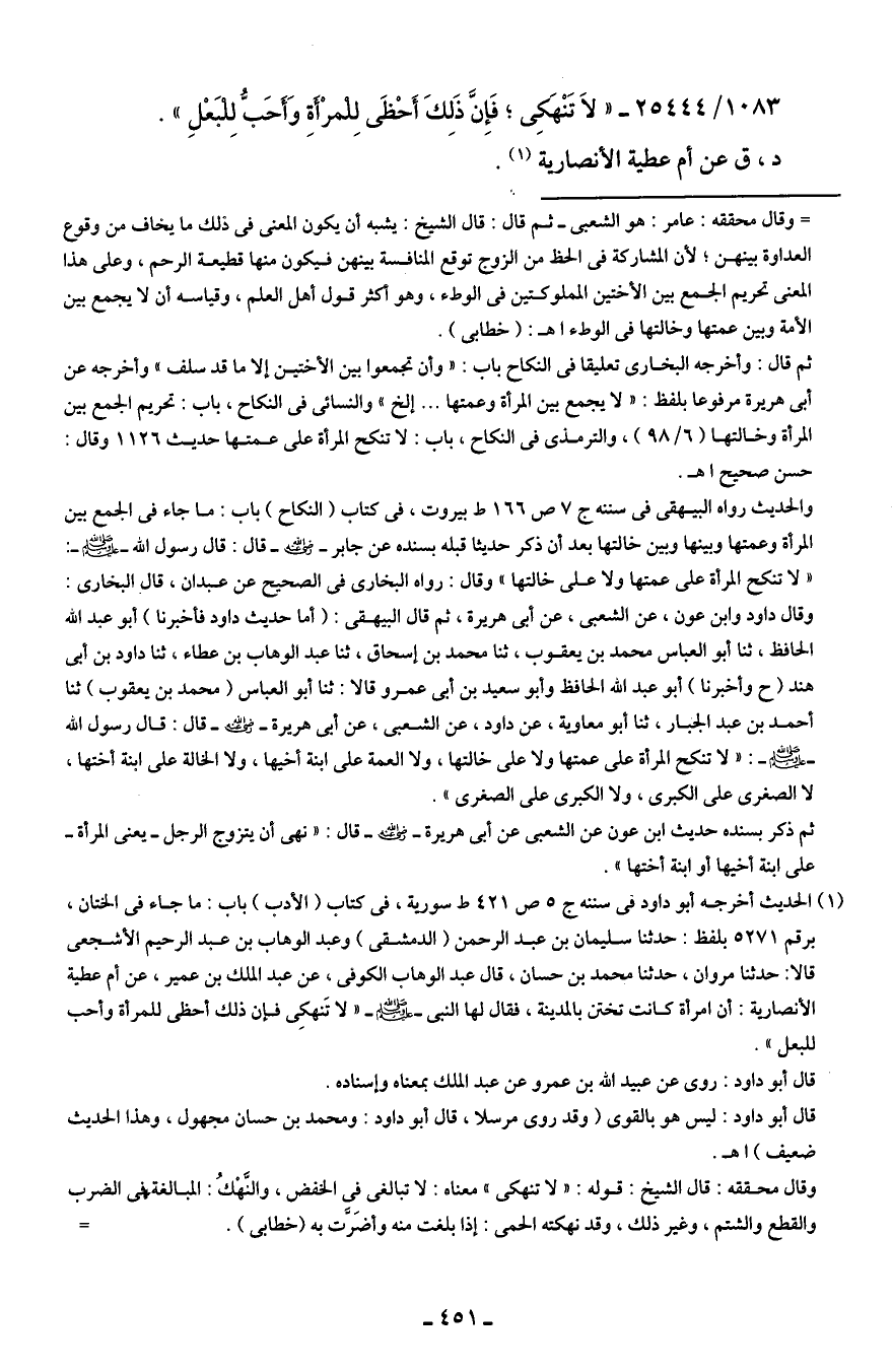 والحديث رواه البيهقى في سننه ج 7 ص 166 ط بيروت، في كتاب (النكاح) باب: ما جاء في الجمع بين المرأة وعمتها وبينها وبين خالتها بعد أن ذكر حديثا قبله بسنده عن جابر - رضي الله عنه - قال: قال رسول الله - صلى الله عليه وسلم -: "لا تنكح المرأة على عمتها ولا على خالتها" وقال: رواه البخارى في الصحيح عن عبدان، قال البخارى: وقال داود وابن عون، عن الشعبى، عن أبى هريرة، ثم قال البيهقى: (أما حديث داود فأخبرنا) أبو عبد الله الحافظ، ثنا أبو العباس محمد بن يعقوب، ثنا محمد بن إسحاق، ثنا عبد الوهاب بن عطاء ثنا داود بن أبى هند (ح وأخبرنا) أبو عبد الله الحافظ وأبو سعيد بن أبى عمرو قالا: ثنا أبو العباس (محمد بن يعقوب) ثنا أحمد بن عبد الجبار، ثنا أبو معاوية، عن داود، عن الشعبى، عن أبى هريرة - رضي الله عنه - قال: قال رسول الله - علصتجنم -: "لا تنكح المرأة على عمتها ولا على خالتها، ولا العمة على ابنة أخيها، ولا الخالة على ابنة أختها، لا الصغرى على الكبرى، ولا الكبرى على الصغرى ".