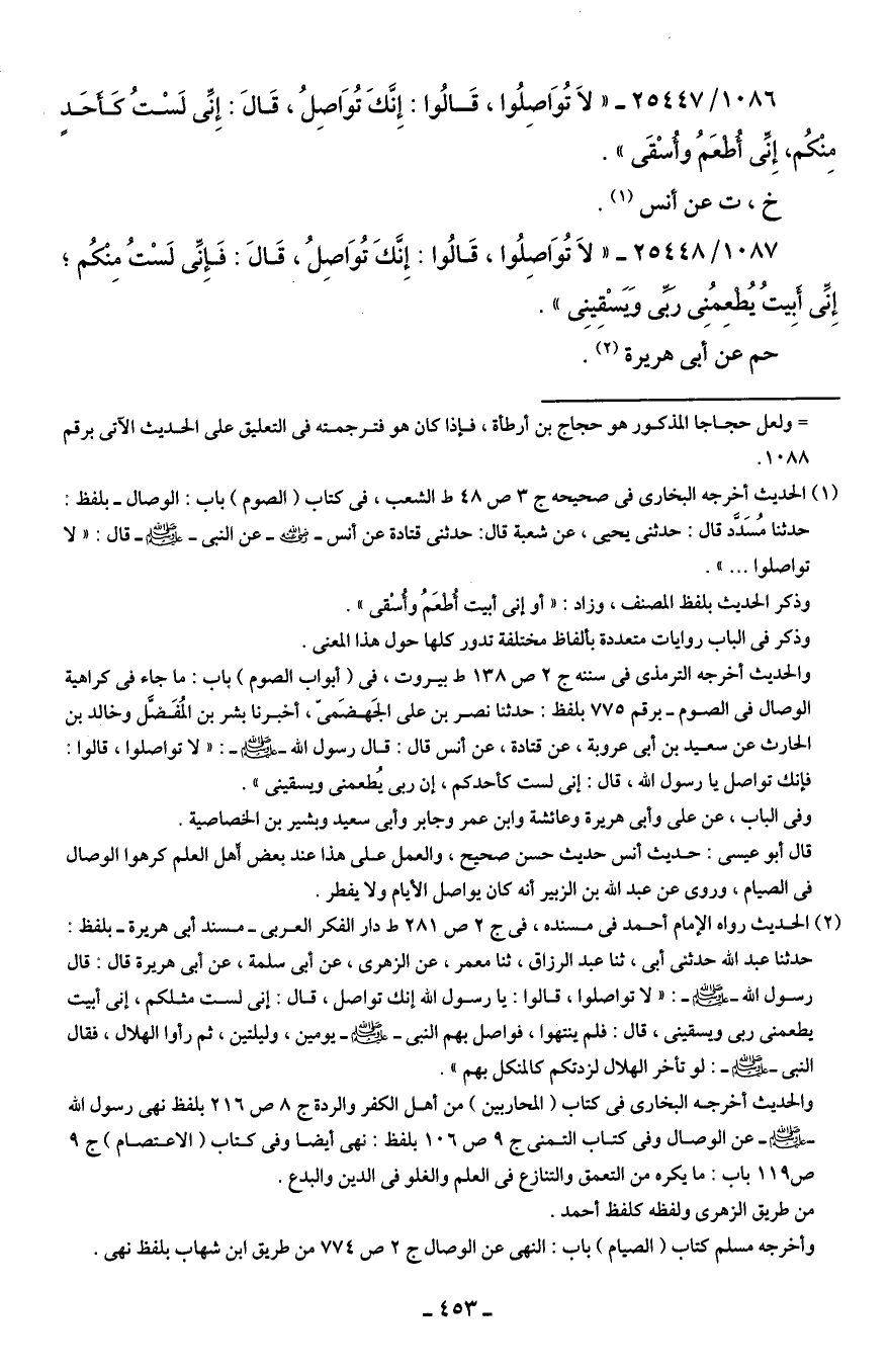 والحديث أخرجه البخارى في كتاب (المحاربين) من أهل الكفر والردة ج 8 ص 216 بلفظ نهى رسول الله - صلى الله عليه وسلم - عن الوصال وفى كتاب التمنى ج 9 ص 106 بلفظ: فهى أيضًا وفى كتاب (الاعتصام) ج 9 ص 119 باب: ما يكره من التعمق والتنازع في العلم والغلو في الدين والبدع.