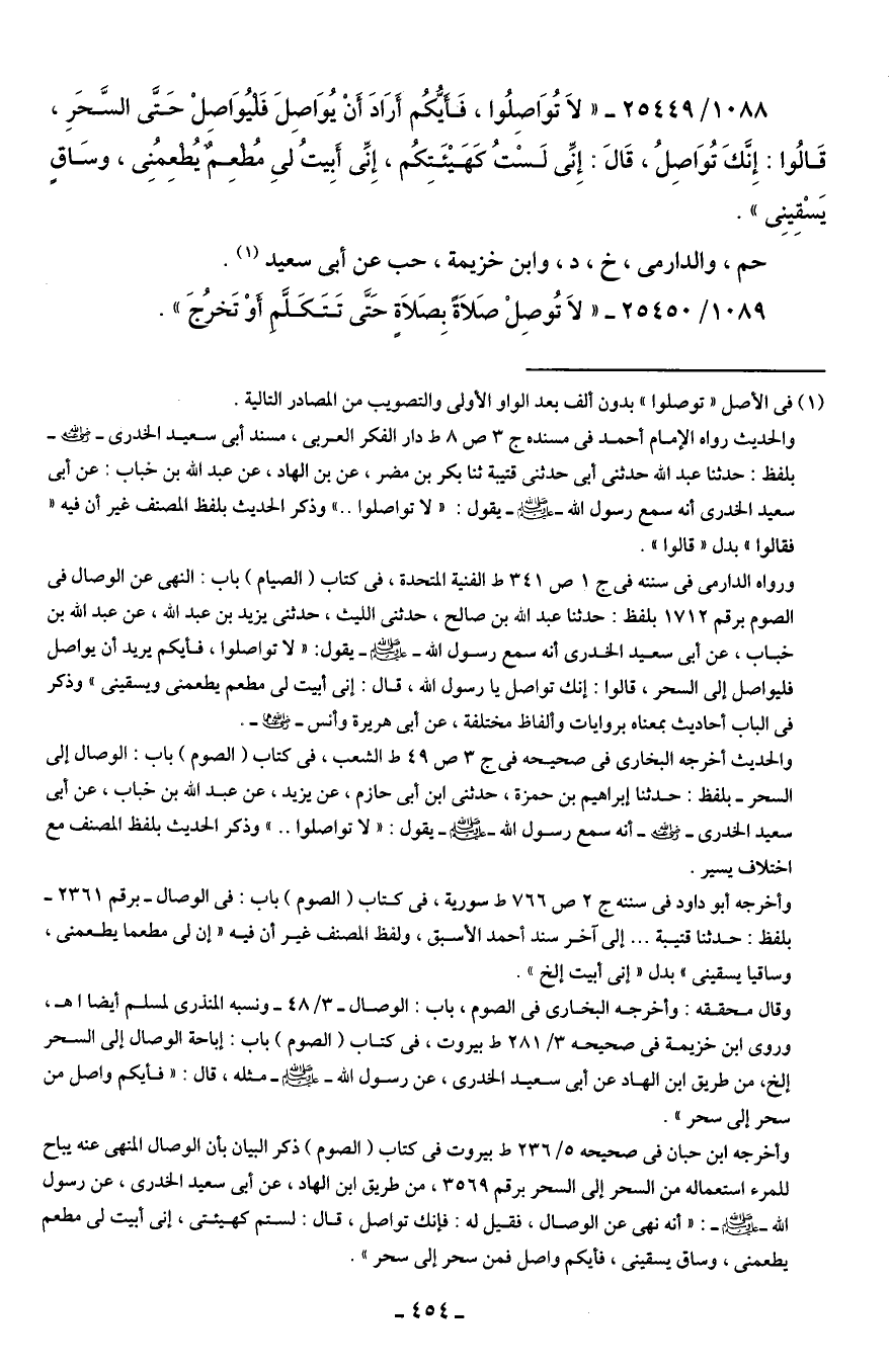 1088/ 25449 - "لَا تُوَاصِلُوا، فَأيُّكُم أَرَادَ أَنْ يُوَاصِلَ فَليُوَاصِلْ حَتَّى السَّحَرِ، قَالُوا: إِنَّكَ تُوَاصِلُ، قَالَ: إِنِّى لَسْتُ كَهَيْئَتِكُم، إِنِّى أَبِيتُ لي مُطْعِمٌ يُطعِمُنِى، وسَاقٍ يَسْقِينِى".
