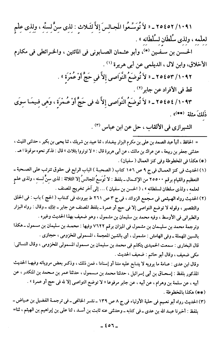 (¬1) الحديث في كنز العمال في ج 9 ص 156 كتاب (الصحبة) الباب الرابع في حقوق تترتب على الصحبة - التعظيم والقيام برقم 25500 من الإكمال - بلفظ: لا تُوَسعُ المجالسُ إلا الثلاثة: لذى سِنٍّ لِسنهِ، ولذى علمٍ لعلمه، ولذى سلطان لسلطانهِ"، (الحسن بن سفيان) ... إلى آخر تخريج المصنف.