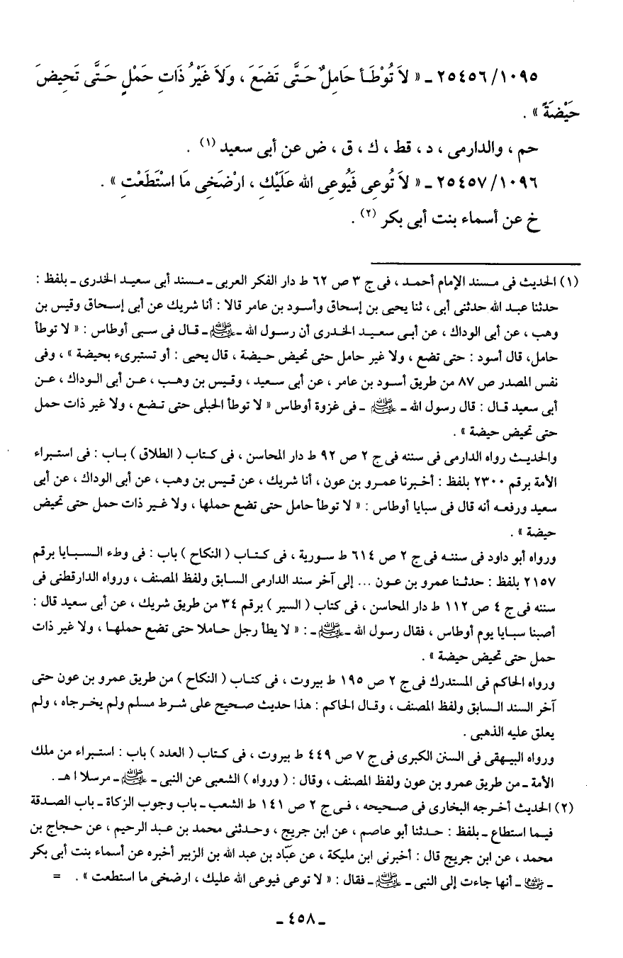 (¬1) الحديث في مسند الإمام أحمد، في ج 3 ص 62 ط دار الفكر العربى - مسند أبى سعيد الخدرى - بلفظ: حدثنا عبد الله حدثنى أبى، ثنا يحيى بن إسحاق وأسود بن عامر قالا: أنا شريك عن أبى إسحاق وقيس بن وهب، عن أبي الوداك، عن أبى سعيد الخدرى أن رسول الله - صلى الله عليه وسلم - قال في سبى أوطاس: "لا توطأ حامل، قال أسود: حتى تضع، ولا غير حامل حتى تحيض حيضة، قال يحيى: أو تستبرئ بحيضة"، وفى نفس المصدر ص 87 من طريق أسود بن عامر، عن أبى سعيد، وقيس بن وهب، عن أبى الوداك، عن أبى سعيد قال: قال رسول الله - صلى الله عليه وسلم - في غزوة أوطاس "لا توطأ الحبلى حتى تضع، ولا غير ذات حمل حتى تحيض حيضة".