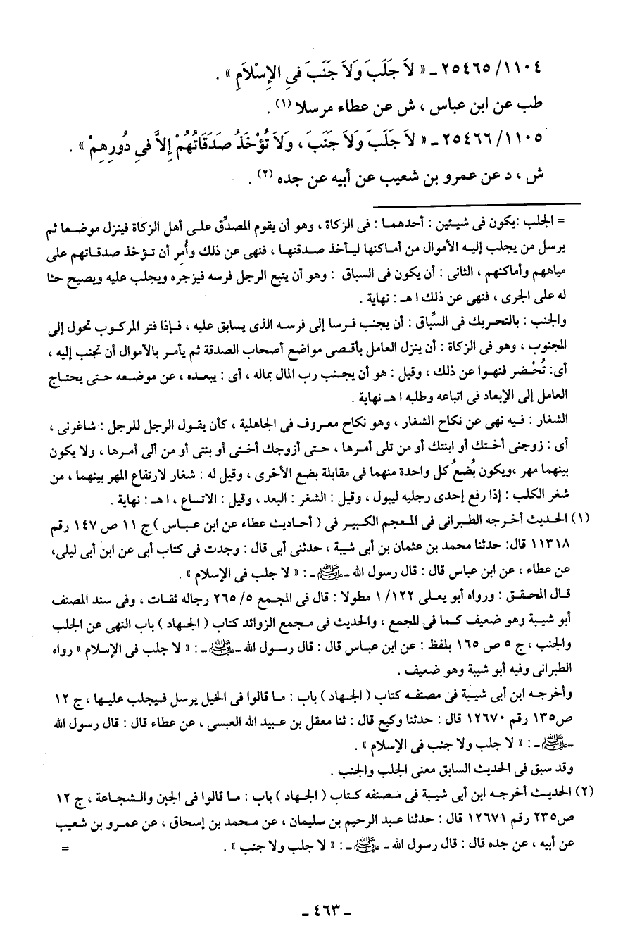 1105/ 25466 - " لاَ جَلَبَ وَلاَ جَنَبَ، وَلاَ تُؤْخَذُ صَدَقَاتُهُمْ إِلَّا في دُورِهِمْ".