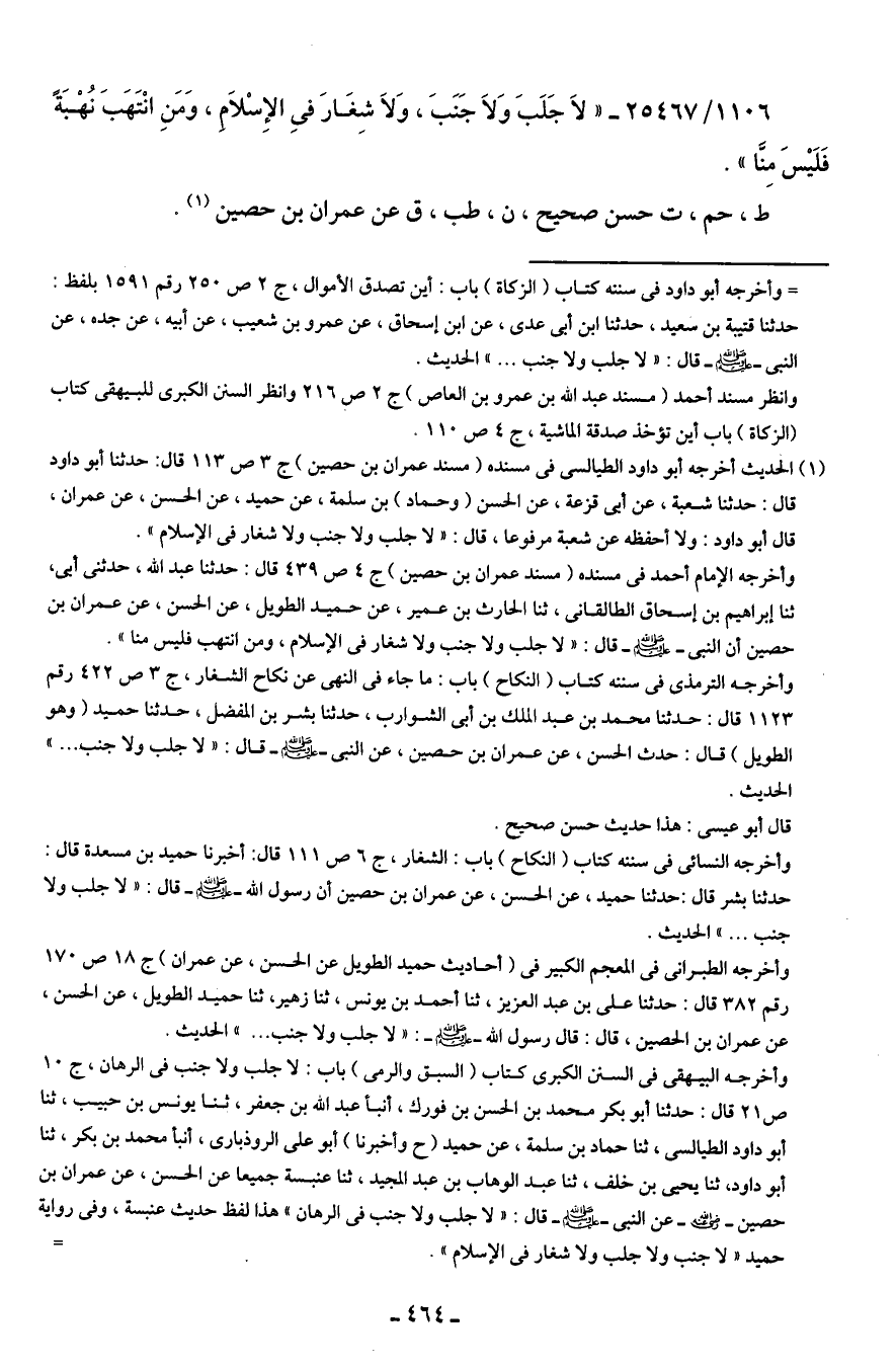 وأخرجه الترمذي في سننه كتاب (النكاح) باب: ما جاء في النهى عن نكاح الشغار، ج 3 ص 422 رقم 1123 قال: حدثنا محمد بن عبد الملك بن أبى الشوارب، حدثنا بشر بن المفضل، حدثنا حميد (وهو الطويل) قال: حدث الحسن، عن عمران بن حصين، عن النبي - صلى الله عليه وسلم - قال: " لا جلب ولا جنب ... " الحديث.