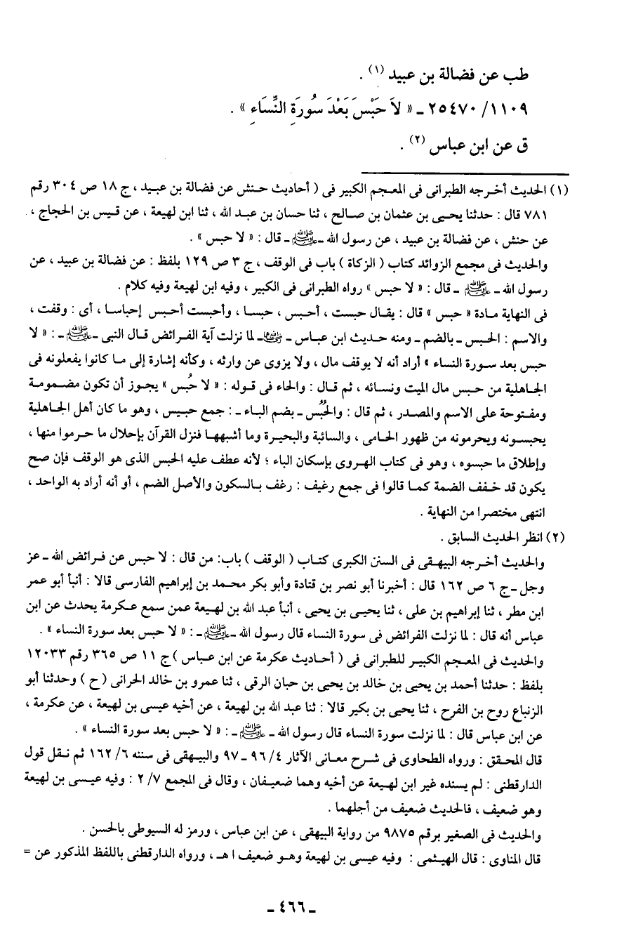 والحديث أخرجه البيهقى في السنن الكبرى كتاب (الوقف) باب: من قال: لا حبس عن فرائض الله - عز وجل - ج 6 ص 162 قال: أخبرنا أبو نصر بن قتادة وأبو بكر محمد بن إبراهيم الفارسى قالا: أنبأ أبو عمر ابن مطر، ثنا إبراهيم بن على، ثنا يحيى بن يحيى، أنبأ عبد الله بن لهيعة عمن سمع عكرمة يحدث عن ابن عباس أنه قال: لما نزلت الفرائض في سورة النساء قال رسول الله - صلى الله عليه وسلم -: " لا حبس بعد سورة النساء".
