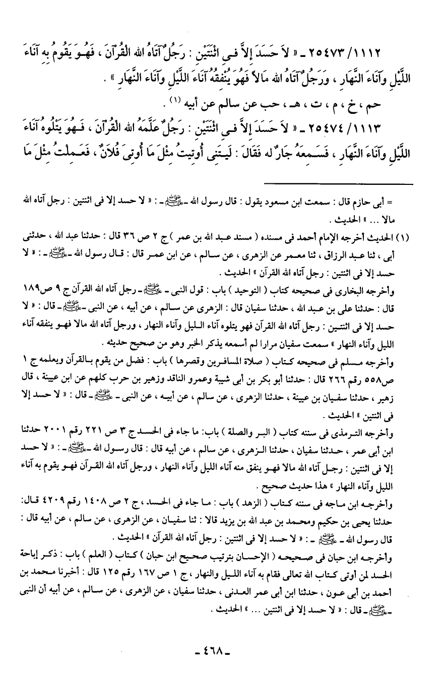 1112/ 25473 - "لاَ حَسَدَ إِلَّا في اثْنَتَيْنِ: رَجُلٌ آتَاهُ الله الْقُرآنَ، فَهُوَ يَقُومُ بِهِ آنَاءَ اللَّيْلِ وآنَاءَ النَّهَارِ، وَرَجُلٌ آتَاهُ الله مَالًا فَهُوَ يُنْفِقُهُ آنَاءَ اللَّيْلِ وآنَاءَ النَّهَارِ".
