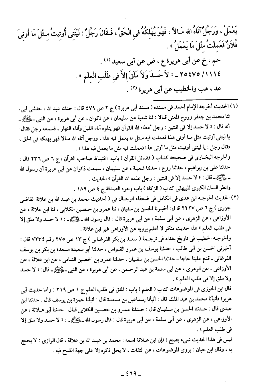 (¬1) الحديث أخرجه الإمام أحمد في مسنده (مسند أبى هريرة) ج 2 ص 479 قال: حدثنا عبد الله، حدثنى أبى، ثنا محمد بن جعفر وروح المعنى قالا: ثنا شعبة عن سليمان، عن ذكوان، عن أبى هريرة، عن النبي - صلى الله عليه وسلم - أنه قال: "لا حسد إلا في اثنتين: رجل أعطاه الله القرآن فهو يتلوه آناء الليل وآناء النهار، فسمعه رجل فقال: يا ليتنى أوتيت مثل ما أوتى هذا فعملت فيه مثل ما يعمل فيه هذا، ورجل آتاه الله مالا فهو يهلكه في الحق، فقال رجل: يا ليتنى أوتيت مثل ما أوتى هذا فعملت فيه مثل ما يعمل فيه هذا".