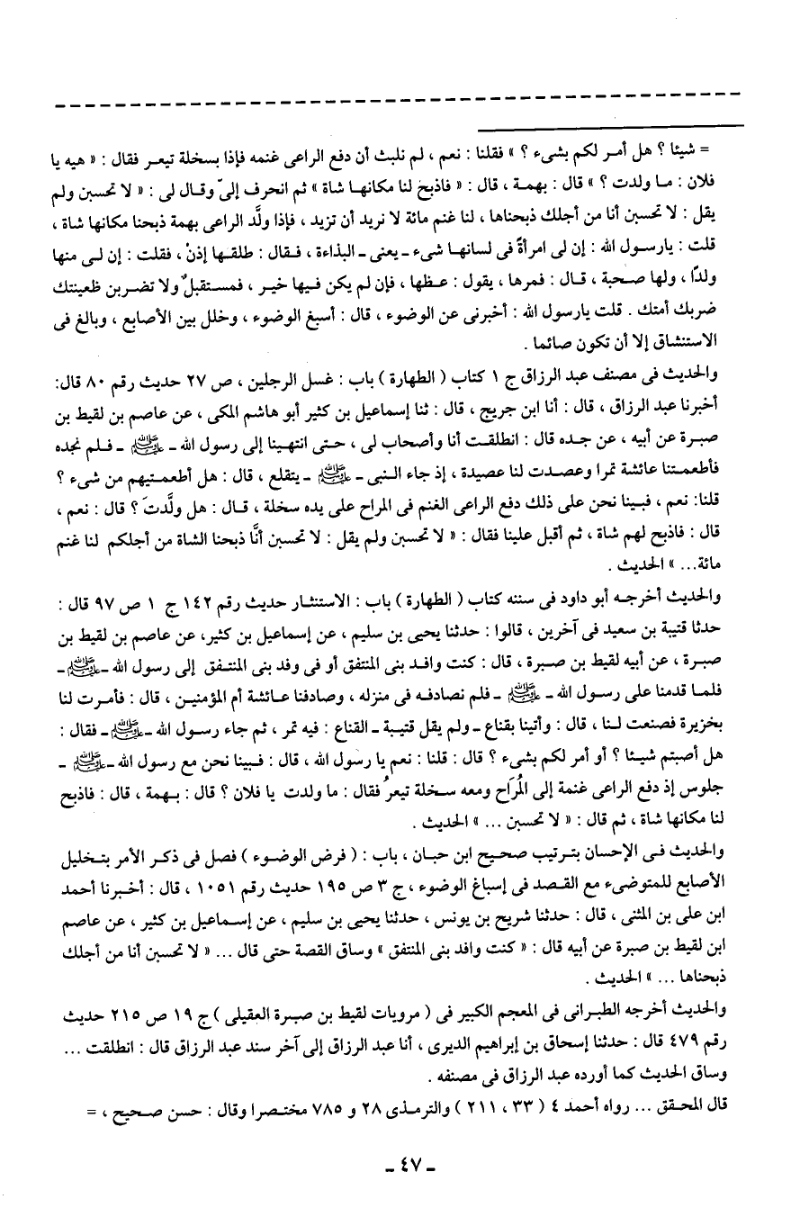 والحديث في مصنف عبد الرزاق ج 1 كتاب (الطهارة) باب: غسل الرجلين، ص 27 حديث رقم 80 قال: أخبرنا عبد الرزاق، قال: أنا ابن جريج، قال: ثنا إسماعيل بن كثير أبو هاشم المكي، عن عاصم بن لقيط بن صبرة عن أبيه، عن جده قال: انطلقت أنا وأصحاب لي، حتى انتهينا إلى رسول الله - صلى الله عليه وسلم - فلم نجده فأطعمتنا عائشة تمرا وعصدت لنا عصيدة، إذ جاء النبي - صلى الله عليه وسلم - ينقلع، قال: هل أطعمنيهم من شيء؟ قلنا: نعم، فبينا نحن على ذلك دفع الراعى الغنم في المراح على يده سخلة، قال: هل ولدتَ؟ قال: نعم، قال: فاذبح لهم شاة، ثم أقبل علينا فقال: "لا تحسبن ولم يقل: لا تحسبن أنَّا ذبحنا الشاة من أجلكم لنا غنم مائة ... " الحديث.