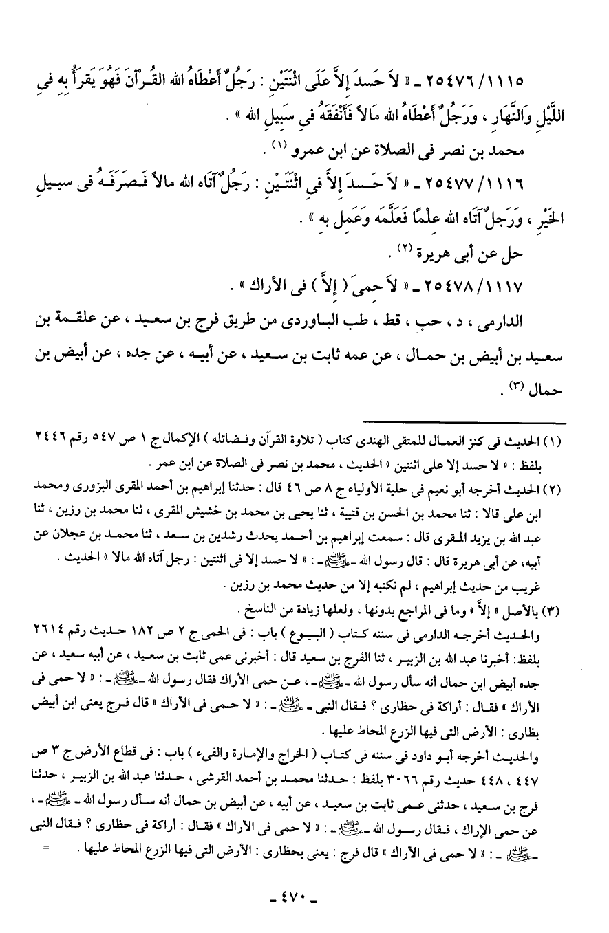 1115/ 25476 - "لاَ حَسدَ إِلَّا عَلَى اثْنَتَيْنِ: رَجُلٌ أَعْطَاهُ الله القُرْآنَ فَهُوَ يَقرَأُ بِهِ في اللَّيْلِ وَالنَّهَارِ، وَرَجُلٌ أَعْطَاهُ الله مَالًا فَأَنْفَقَهُ في سَبِيلِ الله".