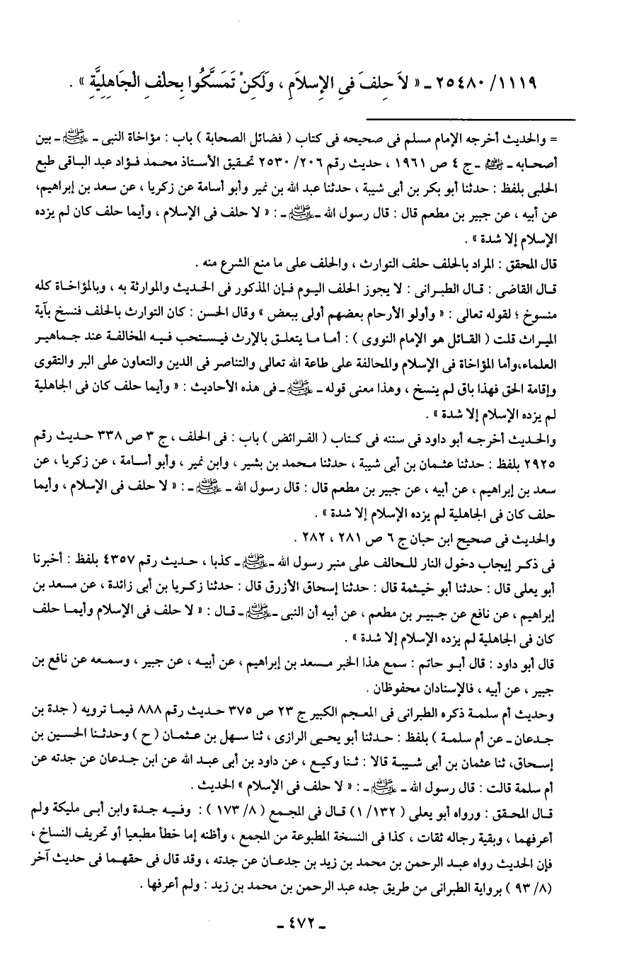 1119/ 25480 - " لاَ حِلفَ في الإِسلاَمِ، وَلَكِن تَمَسَّكُوا بِحلْفِ الْجَاهِلِيَّةِ".