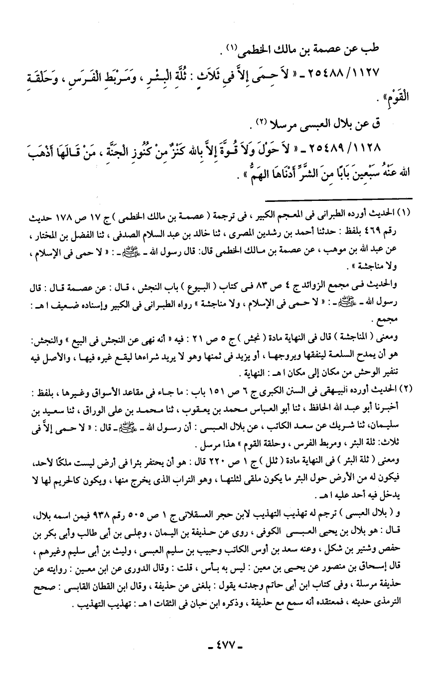 1127/ 25488 - " لاَ حِمَى إِلَّا في ثَلاَثٍ: ثلَّةِ الْبِئْرِ، وَمَرْبَطِ الْفَرَسِ، وَحَلْقَةِ الْقَوْمِ".