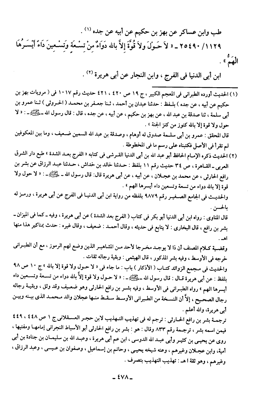 (¬2) الحديث ذكره الإمام الحافظ أبو عبد الله بن أبي الدنيا القرشى في كتابه " الفرج بعد الشدة " طبع دار الشرق العربي - القاهرة، ص 34 حديث رقم 11 بلفظ: حدثنا خالد بن خداش، حدثنا عبد الرزاق عن بشر بن رافع الحارثى، عن محمد بن عجلان، عن أبيه، عن أبى هريرة قال: قال رسول الله - صلى الله عليه وسلم -: " لا حول ولا قوة إلا بالله دواء من تسعة وتسعين داء أيسرها الهم ".
