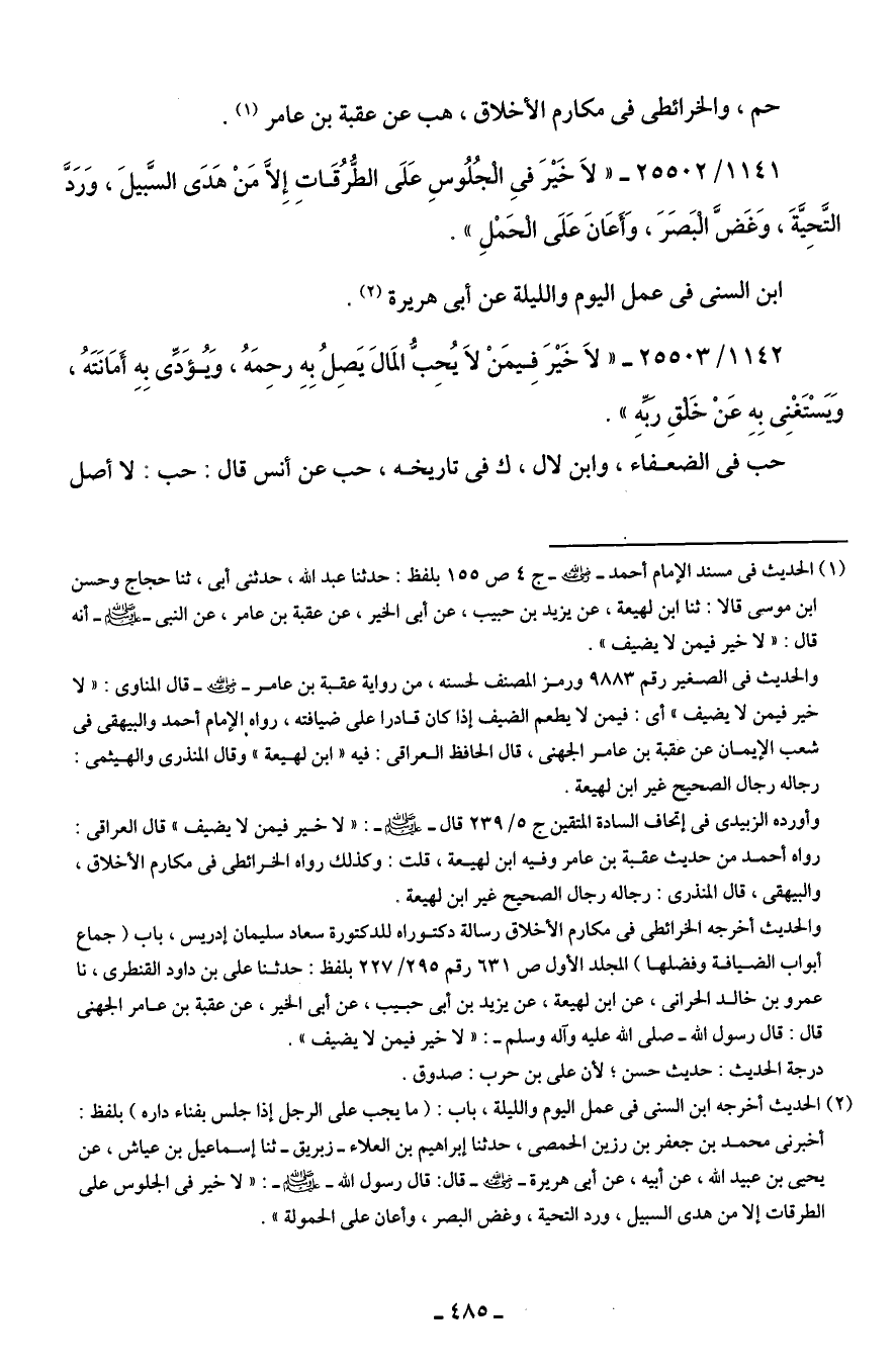 (¬1) الحديث في مسند الإمام أحمد - رضي الله عنه - ج 4 ص 155 بلفظ: حدثنا عبد الله، حدثنى أبى، ثنا حجاج وحسن ابن موسى قالا: ثنا ابن لهيعة، عن يزيد بن حبيب، عن أبى الخير، عن عقبة بن عامر، عن النبي - صلى الله عليه وسلم - أنه قال: " لا خير فيمن لا يضيف".