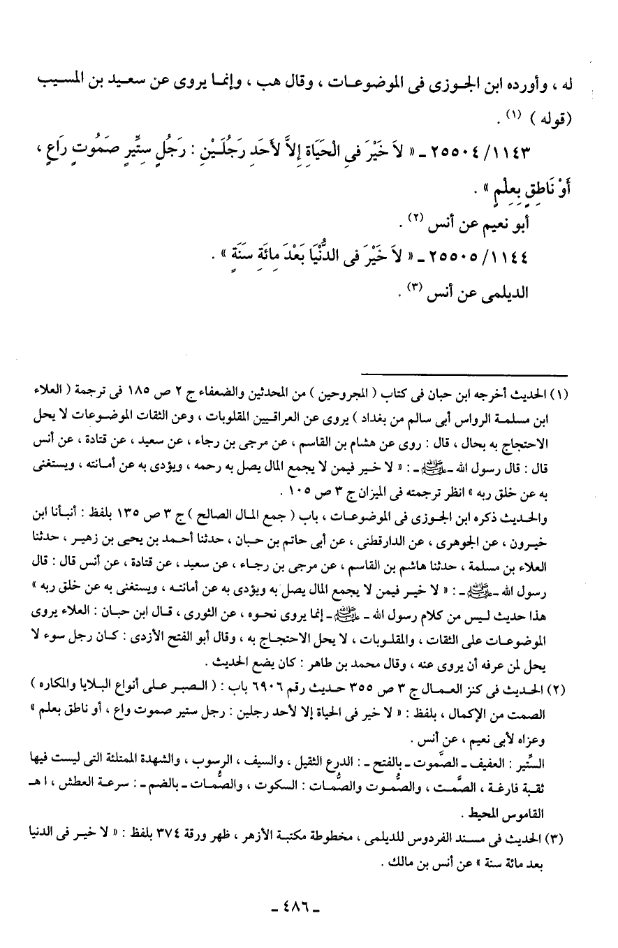 (¬2) الحديث في كنز العمال ج 3 ص 355 حديث رقم 6906 باب: (الصبر على أنواع البلايا والمكاره) الصمت من الإكمال، بلفظ: " لا خير في الحياة إلا لأحد رجلين: رجل ستير صموت واع، أو ناطق بعلم" وعزاه لأبى نعيم، عن أنس.