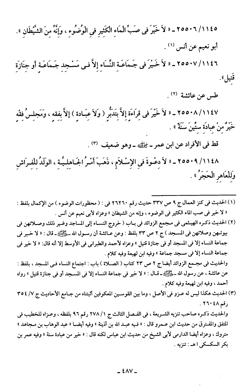 1145/ 25506 - " لاَ خَيْرَ في صَبِّ الْمَاءِ الْكَثِيرِ في الْوُصوءِ، وَإنَّهُ مِنَ الشَّيْطَانِ".