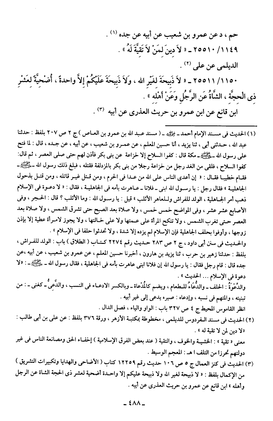 (¬3) الحديث في كنز العمال ج 5 ص 106 حديث رقم 12259 كتاب (الأضاحى والهدايا وتكبيرات التشريق) من الإكمال بلفظ: "لا ذبيحة لغير الله ولا ذبيحة عليكم إلا واحدة أضحية لعشر ذى الحجة الشاة عن الرجل وأهله" ابن قانع عن عمرو بن حريث، العذرى عن أبيه.