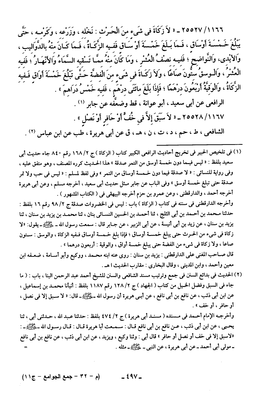 1166/ 25527 - "لاَ زَكَاةَ في شَئ مِنَ الْحَرْثِ: نَخْلِهِ، وَزَرْعِهِ، وَكَرْمِهِ، حَتَّى يَبْلُغَ خَمْسَةَ أوْ سَاقٍ، فَمَا بَلَغَ خَمْسَةَ أوْ سَاقٍ فَفِيهِ الزَّكَاةُ، فَمَا كَانَ مِنْهُ بالدَّوَالِيبِ، وَالأيْدى، وَالنَّواضِحِ؛ فَفِيهِ نِصْفُ الْعُشْرِ، وَمَا كَانَ مِنْهُ ممَّا تَسْقِيهِ السَّمَاءُ وَالأَنْهَارُ؛ فَفِيهِ الْعُشْرُ، وَالْوسقُ سِتُّونَ صَاعًا، وَلاَ زَكَاةَ في شَئٍ مِنَ الْفِضَّةِ حَتَّى تَبْلُغَ حمْسَةَ أوَاقٍ فَفِيهِ الزَّكاةُ، وَالْوَقِيَّةُ أَرْبَعُونَ دِرْهَمًا؛ فَإِذَا بَلَغَ مِائَتَى دِرْهمٍ، فَفِيهِ خَمْسُ دَرَاهمَ".
