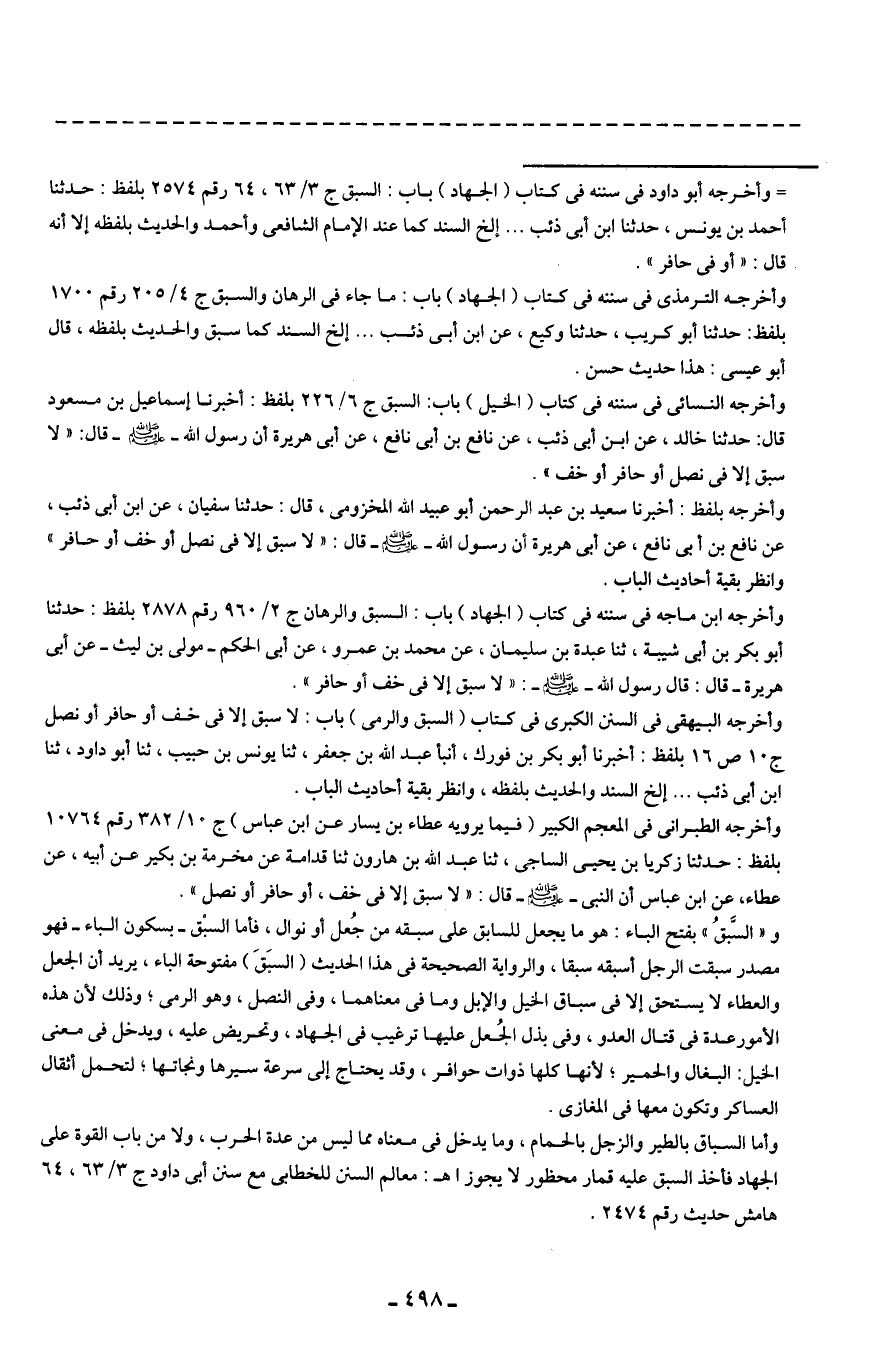 وأخرجه ابن ماجه في سننه في كتاب (الجهاد) باب: السبق والرهان ج 2/ 960 رقم 2878 بلفظ: حدثنا أبو بكر بن أبى شيبة، ثنا عبدة بن سليمان، عن محمد بن عمرو، عن أبى الحكم - مولى بن ليث - عن أبى هريرة - قال: قال رسول الله - صلى الله عليه وسلم -: "لا سبق إلا في خف أو حافر".
