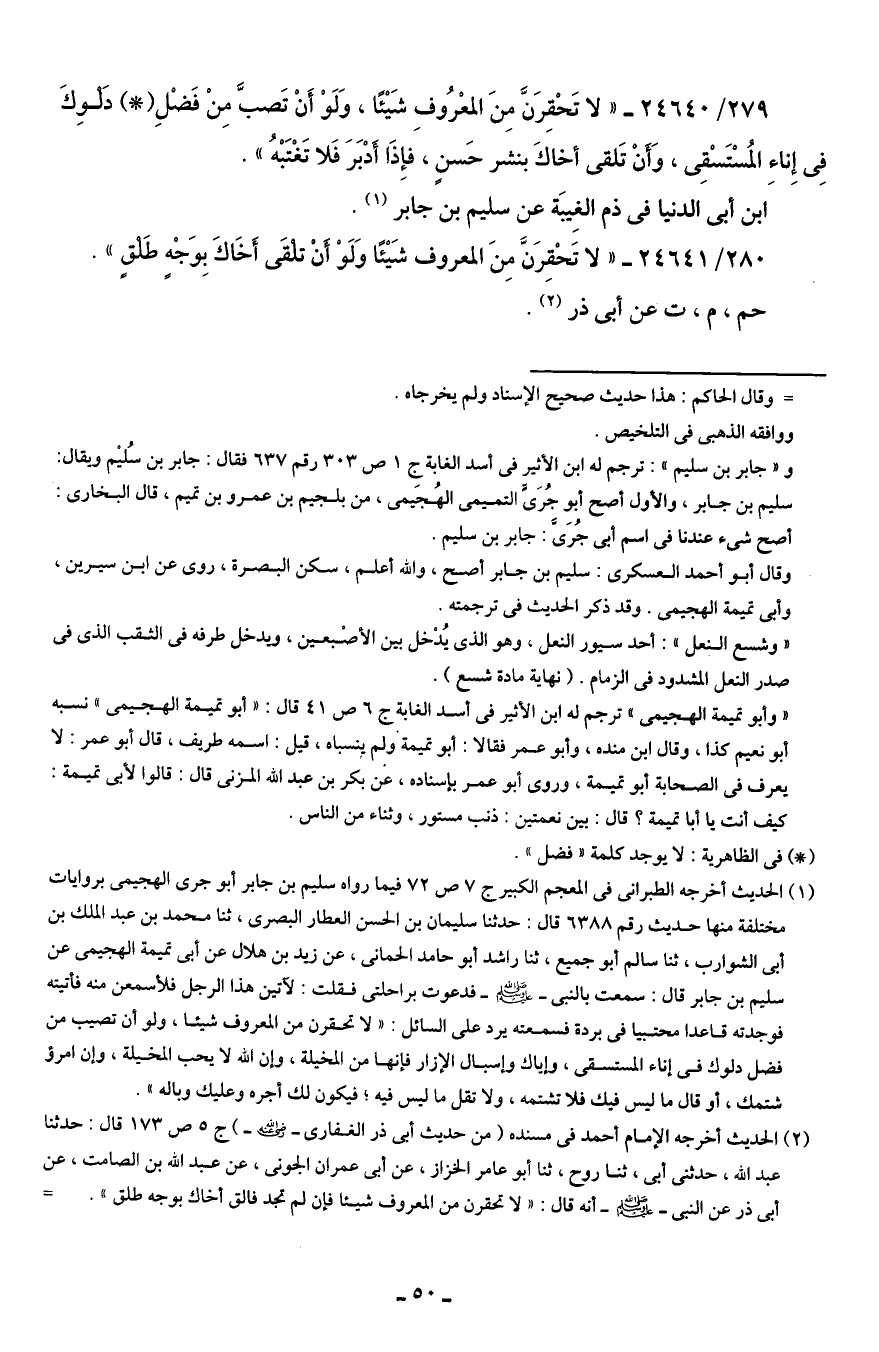280/ 24641 - "لا تَحْقِرَنَّ مِنَ المعروف شَيئًا وَلَوْ أنْ تلقَى أخَاكَ بِوَجْهٍ طَلقٍ".