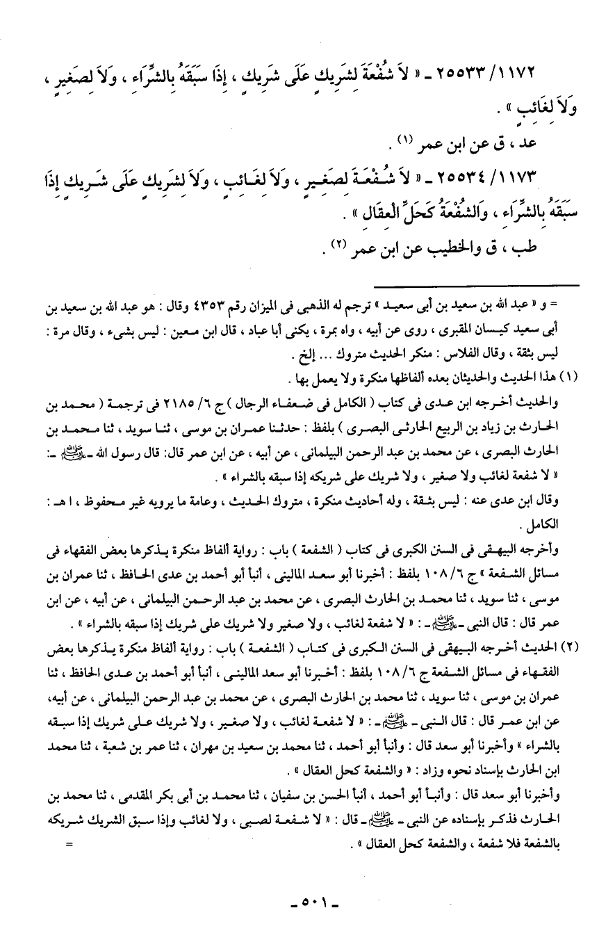 1173/ 25534 - "لاَ شُفْعَةَ لِصَغِيرٍ، وَلاَ لغَائِبٍ، وَلاَ لشَرِيكٍ عَلَى شَرِيكٍ إِذَا سَبَقَهُ بِالشِّرَاءِ، وَالشُّفْعَةُ كَحَلِّ الْعِقَالِ".