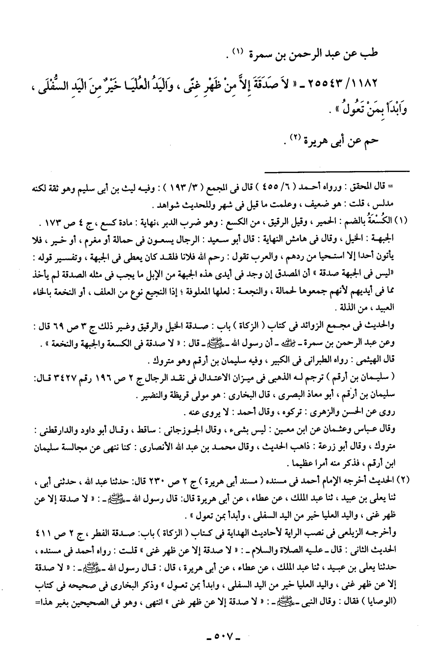 1182/ 25543 - "لاَ صَدَقَةَ إِلاَّ مِنْ ظَهْرِ غِنًى، وَالْيَدُ الْعُليَا خَيْرٌ مِنَ الْيَد السُّفْلَى، وَابْدَأ بِمَنْ تَعُولُ".