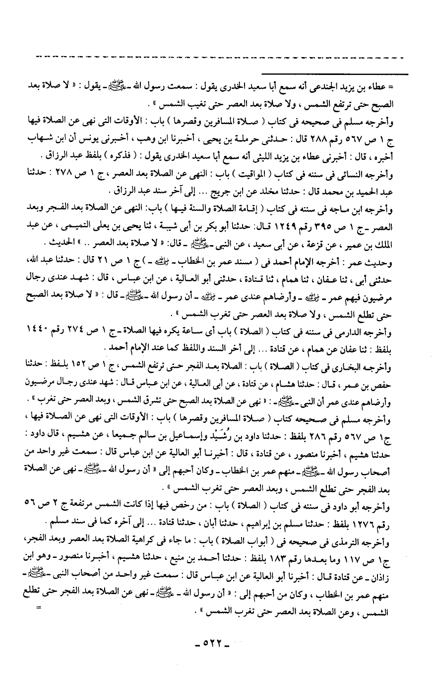 وحديث عمر: أخرجه الإمام أحمد في (مسند عمر بن الخطاب - رضي الله عنه -) ج 1 ص 21 قال: حدثنا عبد الله، حدثني أبي، ثنا عفان، ثنا همام، ثنا قتادة، حدثني أبو العالية، عن ابن عباس، قال: شهد عندي رجال مرضيون فيهم عمر - رضي الله عنه - وأرضاهم عندي عمر - رضي الله عنه - أن رسول الله - صلى الله عليه وسلم - قال: "لا صلاة بعد الصبح حتى تطلع الشمس، ولا صلاة بعد العصر حتى تغرب الشمس".