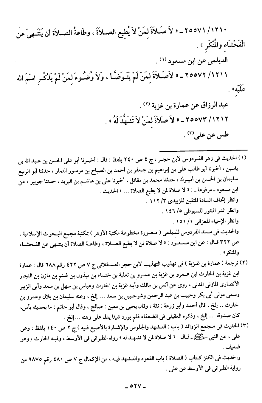 (¬1) الحديث في زهر الفردوس لابن حجر، ج 4 ص 240 بلفظ: قال: أخبرنا أبو علي الحسن بن عبد الله بن ياسين، أخبرنا أبو طالب علي بن إبراهيم بن جعفر بن أحمد بن الصباح بن مرمور التمار، حدثنا أبو الربيع سليمان بن الحسن بن أميرك، حدثنا محمد بن مقاتل، أخبرنا علي بن هاشم بن البريد، حدثنا جويبر، عن ابن مسعود - مرفوعًا -: "لا صلاة لمن لا يطيع الصلاة ... " الحديث.