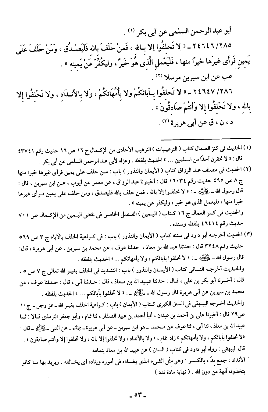 286/ 24647 - "لا تَحلِفُوا بِآبائكُمْ ولا بِأُمَّهَاتكُمْ، وَلا بِالأندَادِ، ولا تَحْلِفُوا إِلا بِاللهِ، ولا تَحْلِفُوا إِلا وَأنتُمْ صَادِقُونَ".