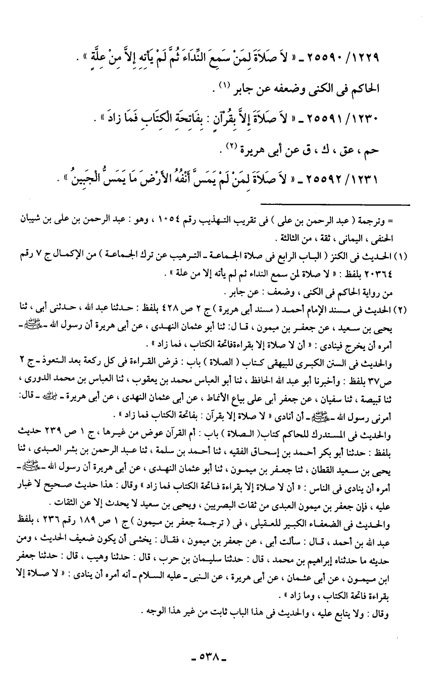 1231/ 25592 - "لَا صَلاَةَ لِمَنْ لَمْ يَمَسَّ أَنْفُهُ الأَرْضَ مَا يَمَسُّ الْجَبِينُ".