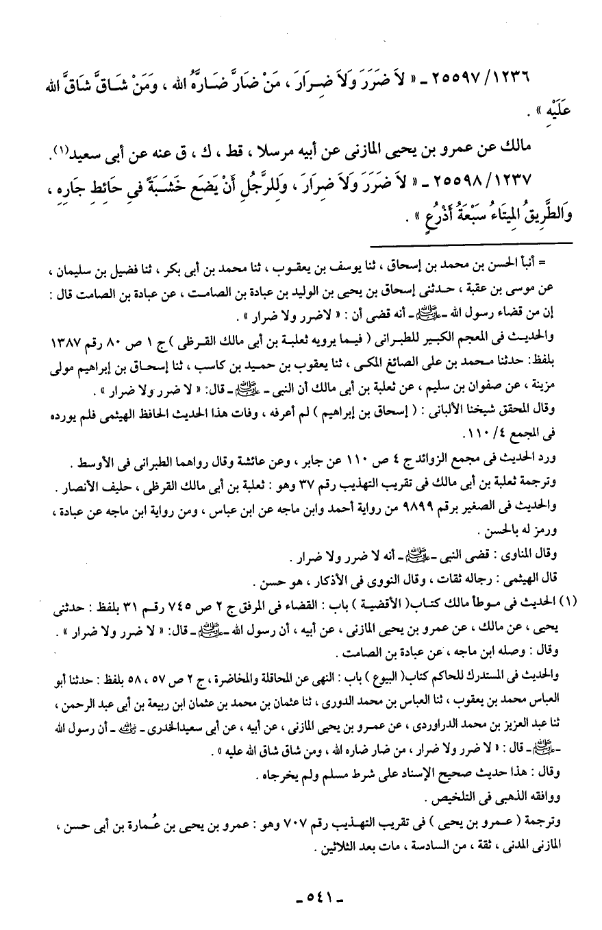 1237/ 25598 - "لَا ضَرَرَ وَلَا ضِرَارَ، وَلِلرَّجُلِ أَنْ يضَع حْشَبَةً في حَائِط جَارِهِ، وَالطَّرِيقُ المِيتَاءُ سَبْعَةُ أَذْرُعٍ".